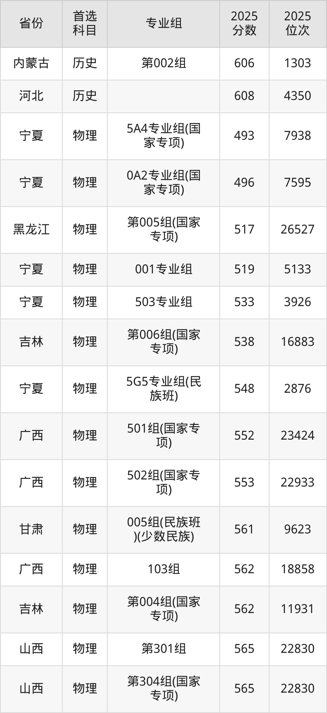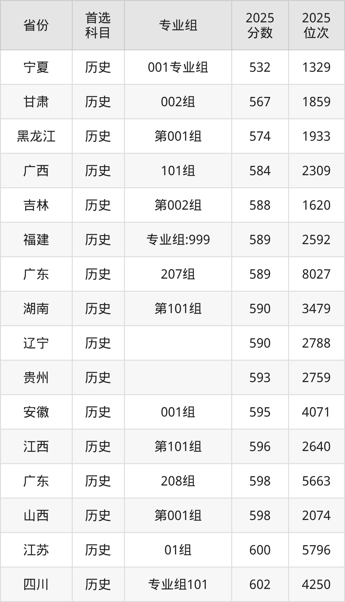 历史类最低分对应地区为宁夏(001专业组),录取位次为1329,超本科B128分;最高分对应地区为河北,录取位次为4350,超本科线131分。
