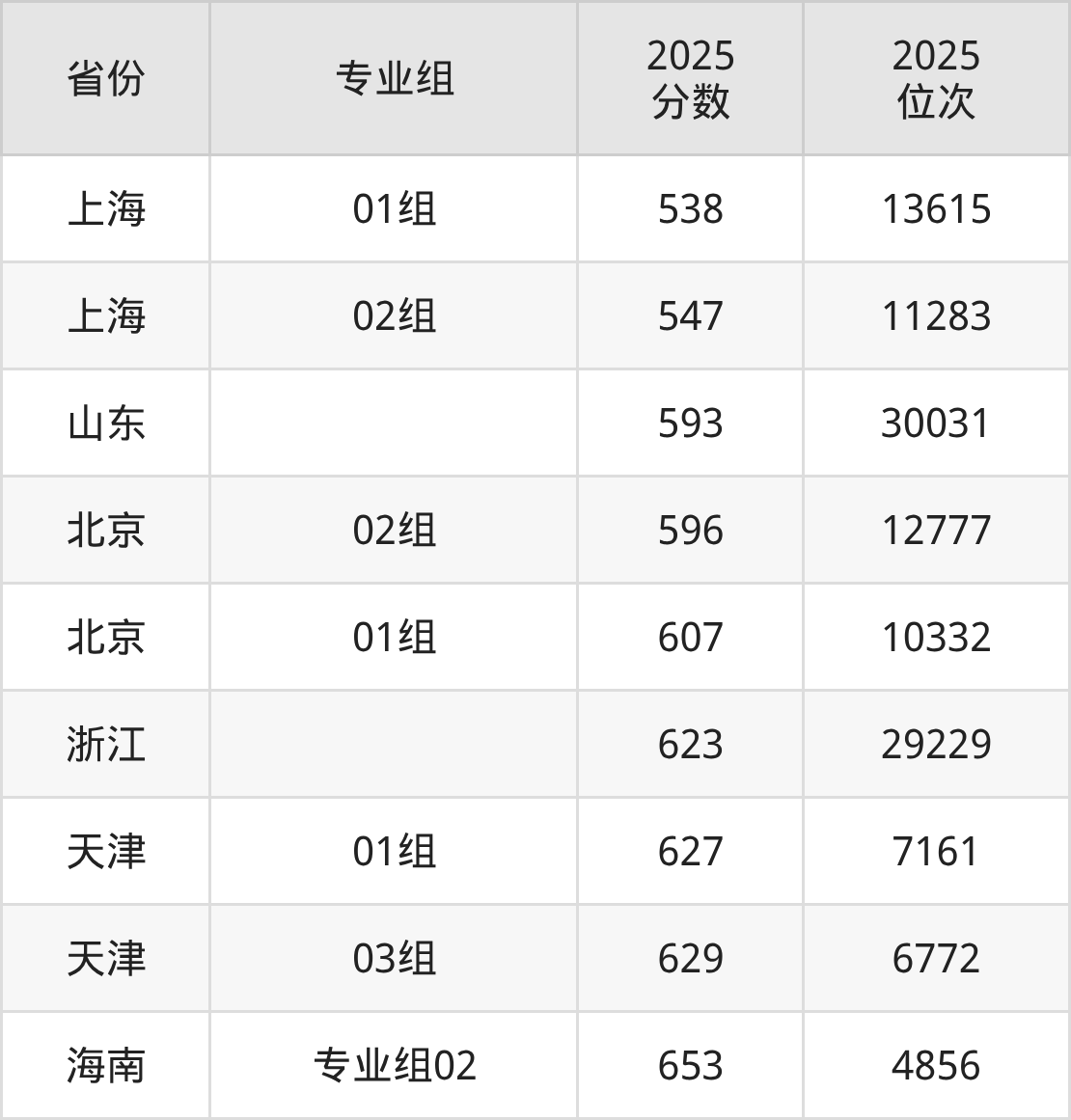 最低分对应地区为上海(01组),录取位次为13615,超本科线136分;最高分对应地区为海南(专业组02),录取位次为4856,超本科线173分。