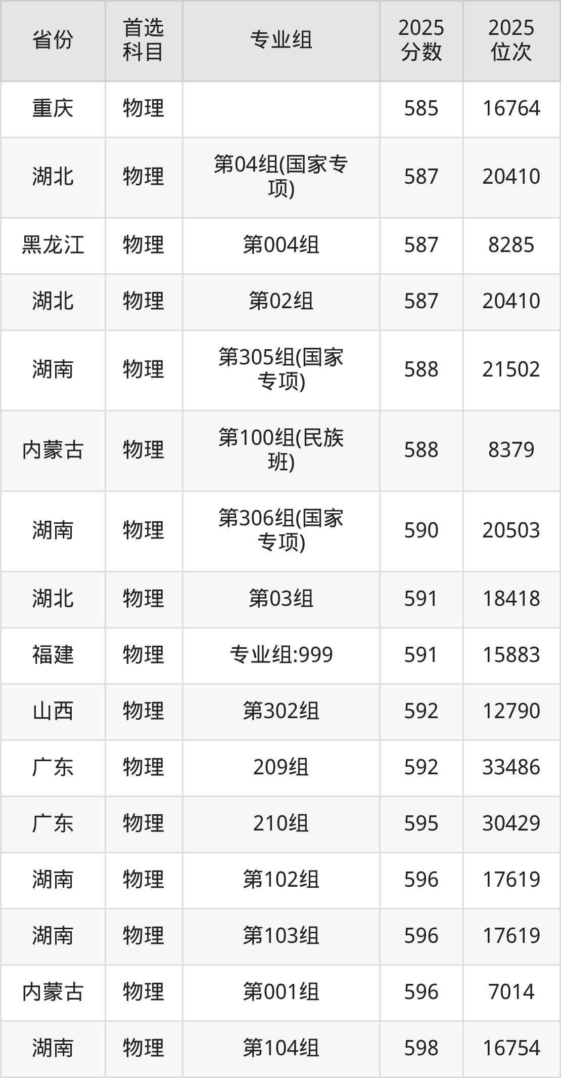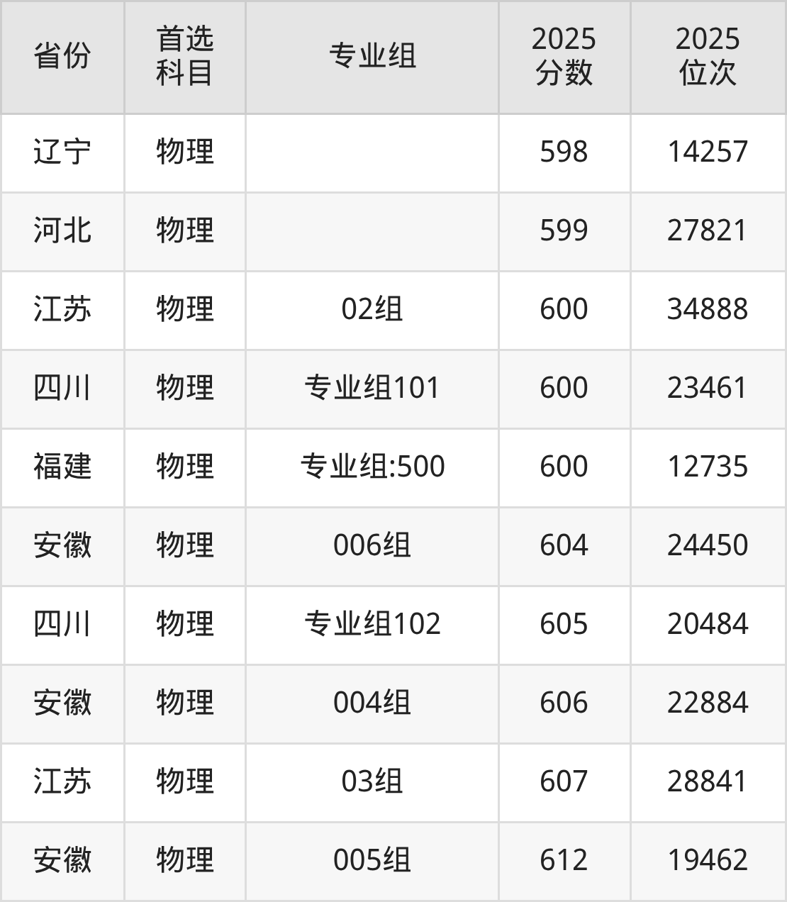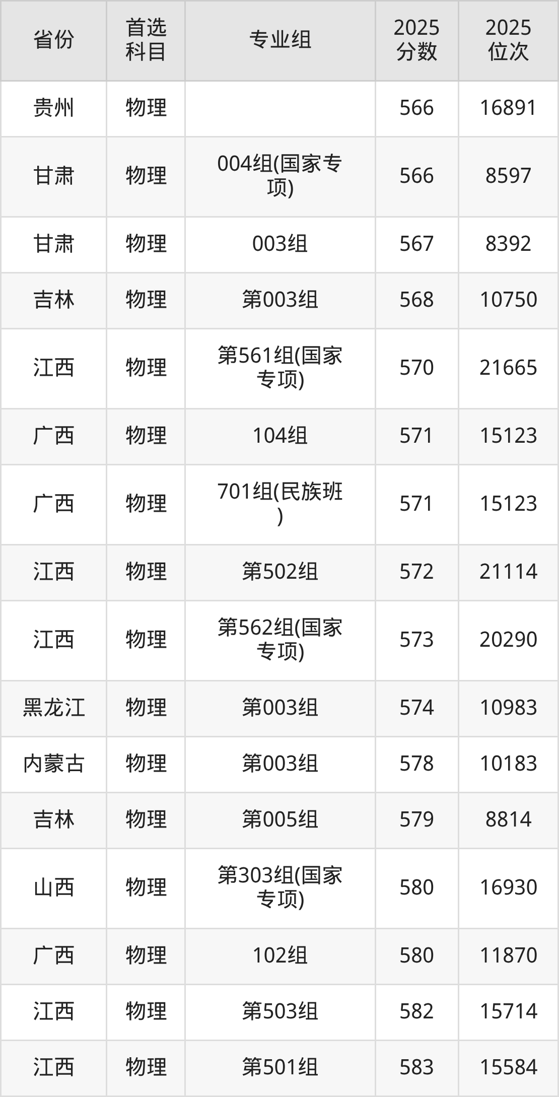 物理类最低分对应地区为宁夏(5A4专业组(国家专项)),录取位次为7938,超本科B121分;最高分对应地区为安徽(005组),录取位次为19462,超本科线151分。