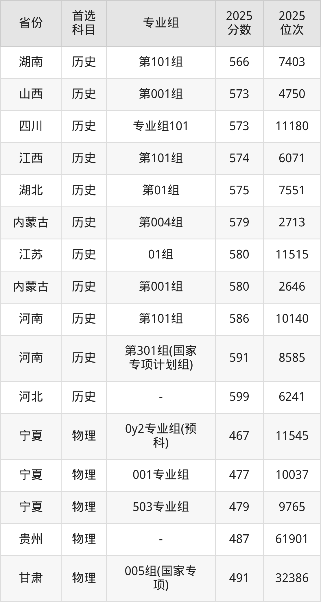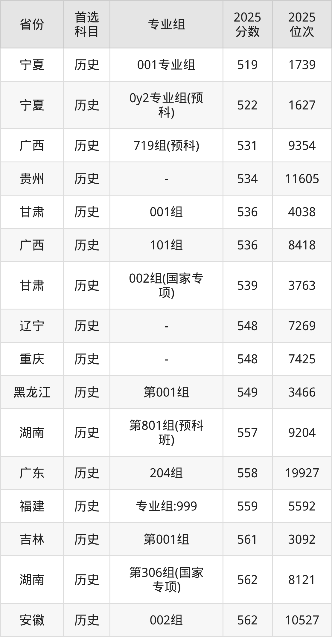 历史类最低分对应地区为宁夏(001专业组),录取位次为1739,超本科B115分;最高分对应地区为河北,录取位次为6241,超本科线122分。
