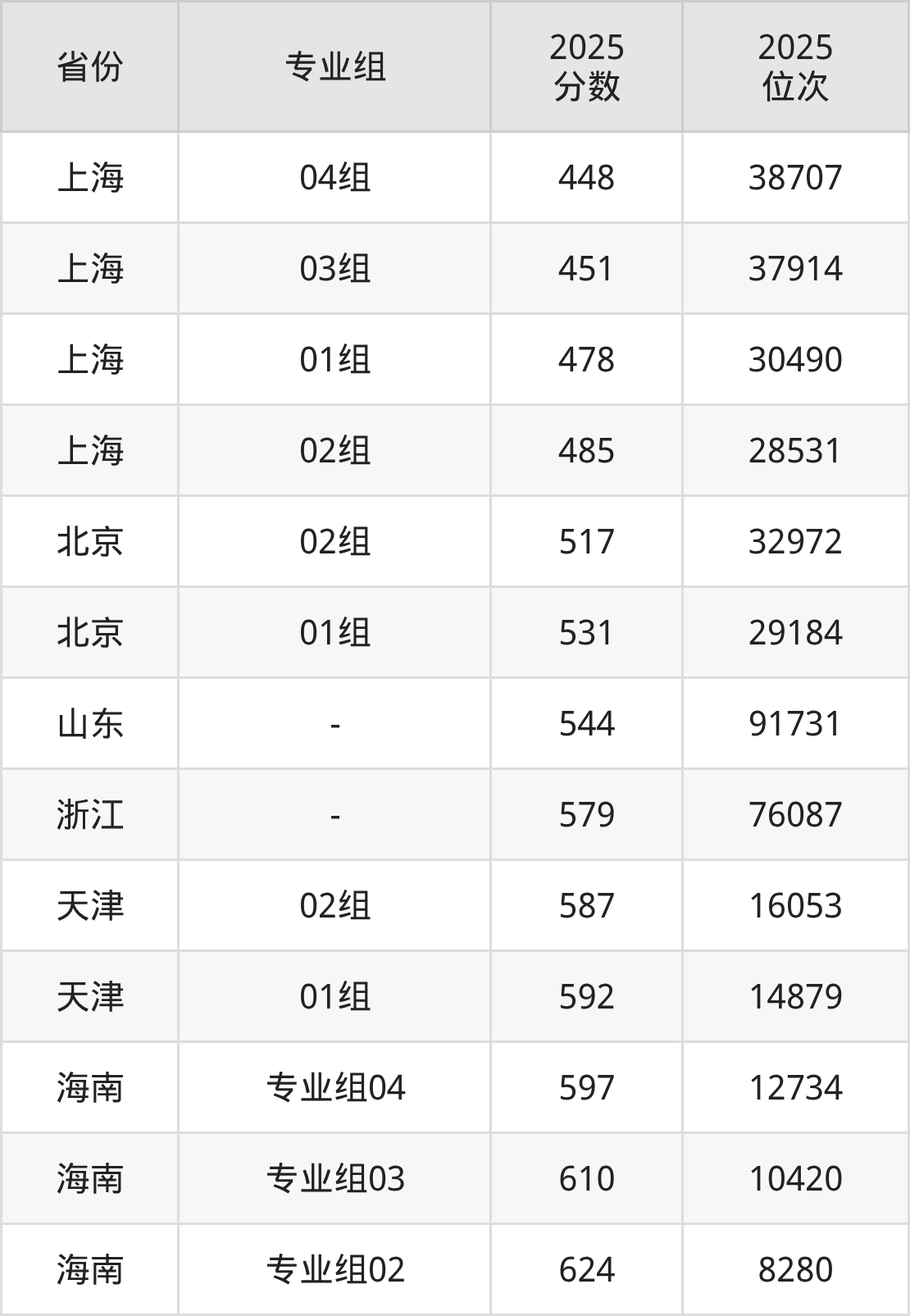 最低分对应地区为上海(04组),录取位次为38707,超本科线46分;最高分对应地区为海南(专业组02),录取位次为8280,超本科线144分。
