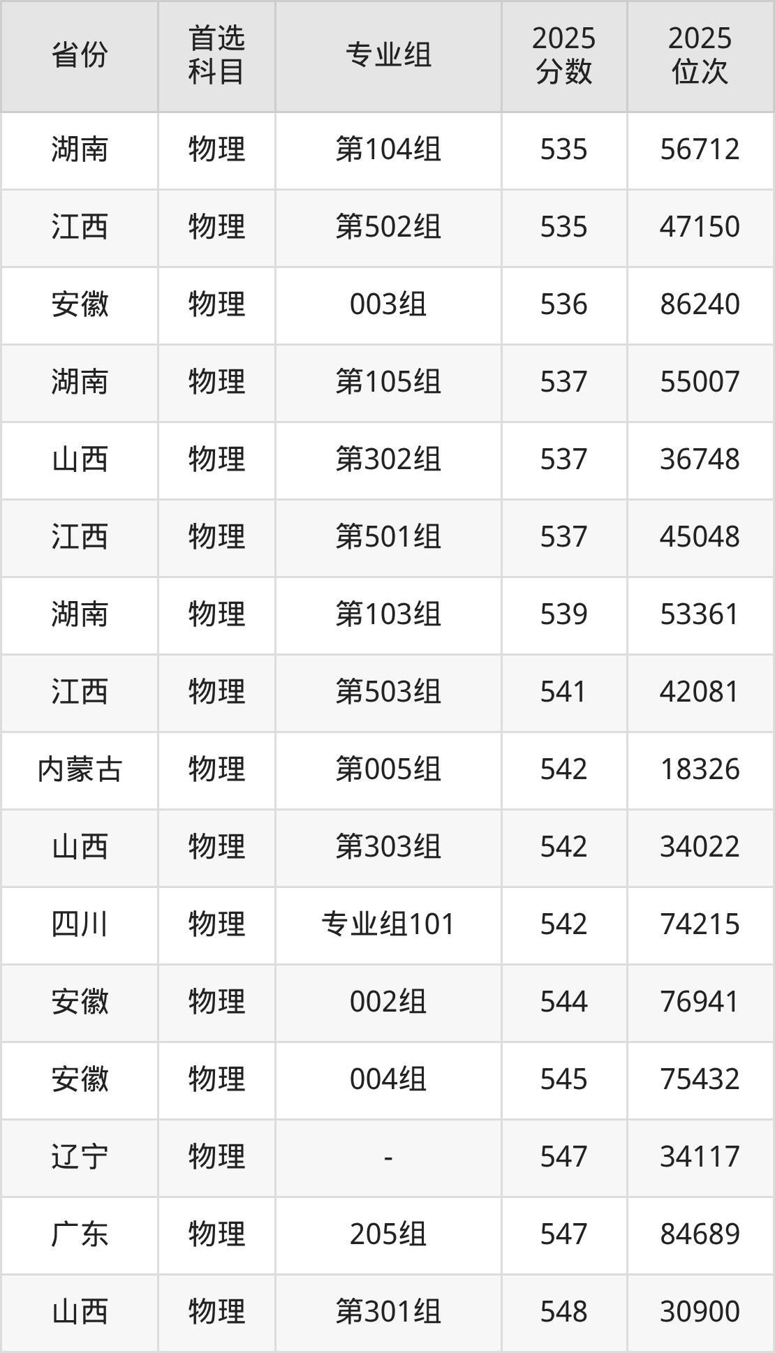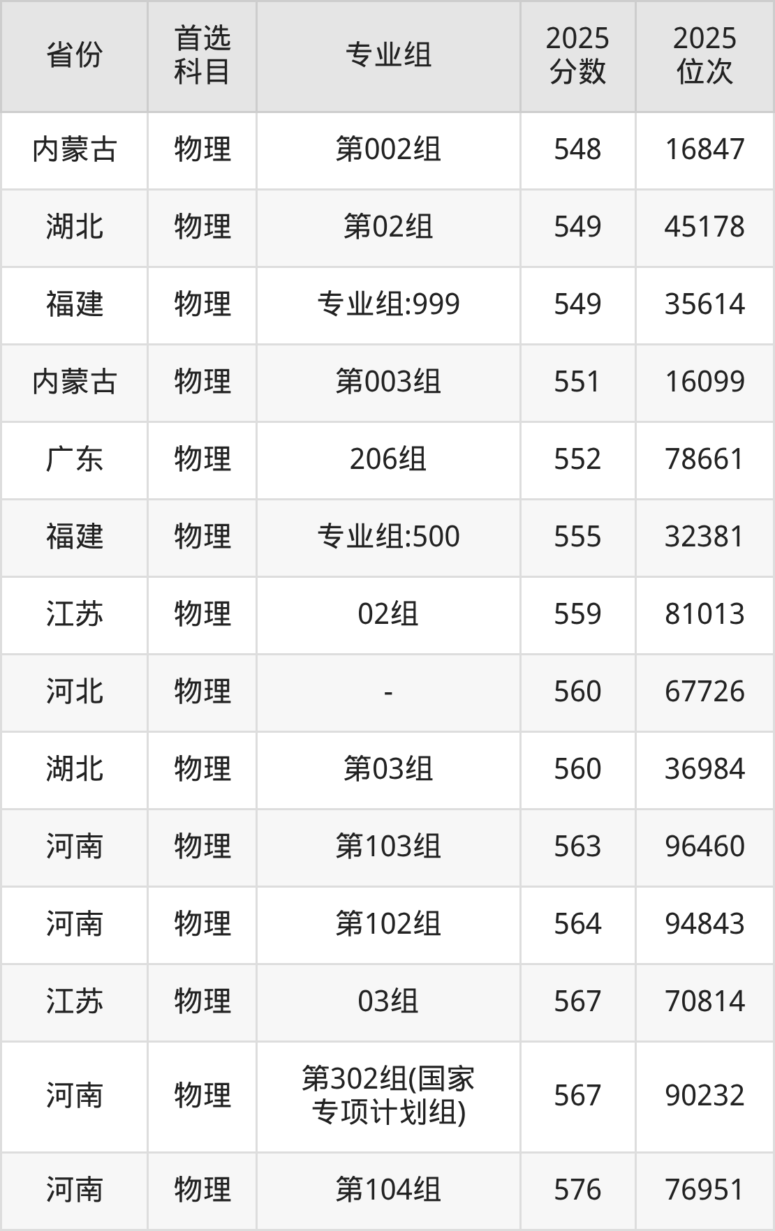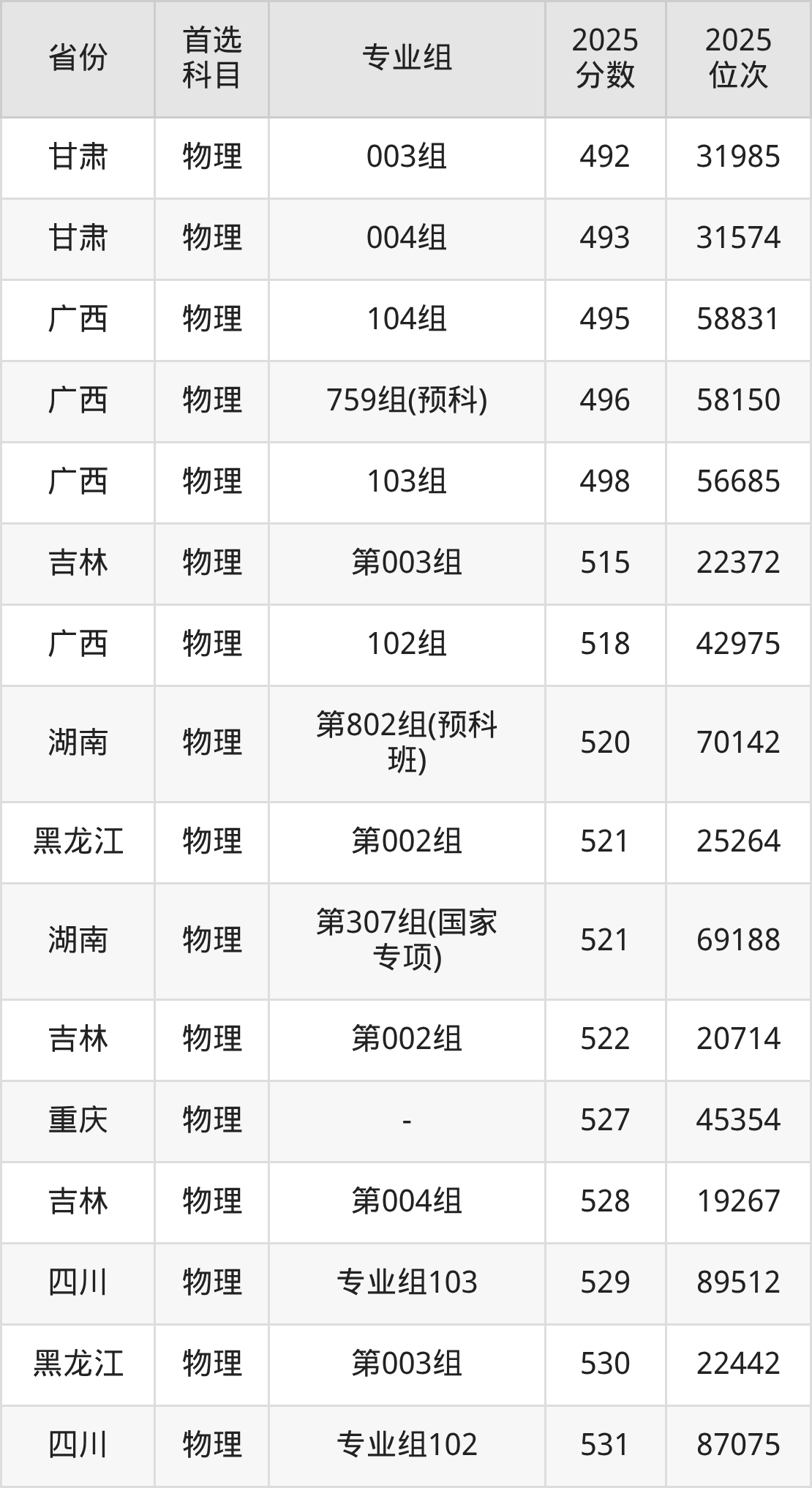 物理类最低分对应地区为宁夏(0y2专业组(预科)),录取位次为11545,超本科B95分;最高分对应地区为河南(第104组),录取位次为76951,超本科线149分。