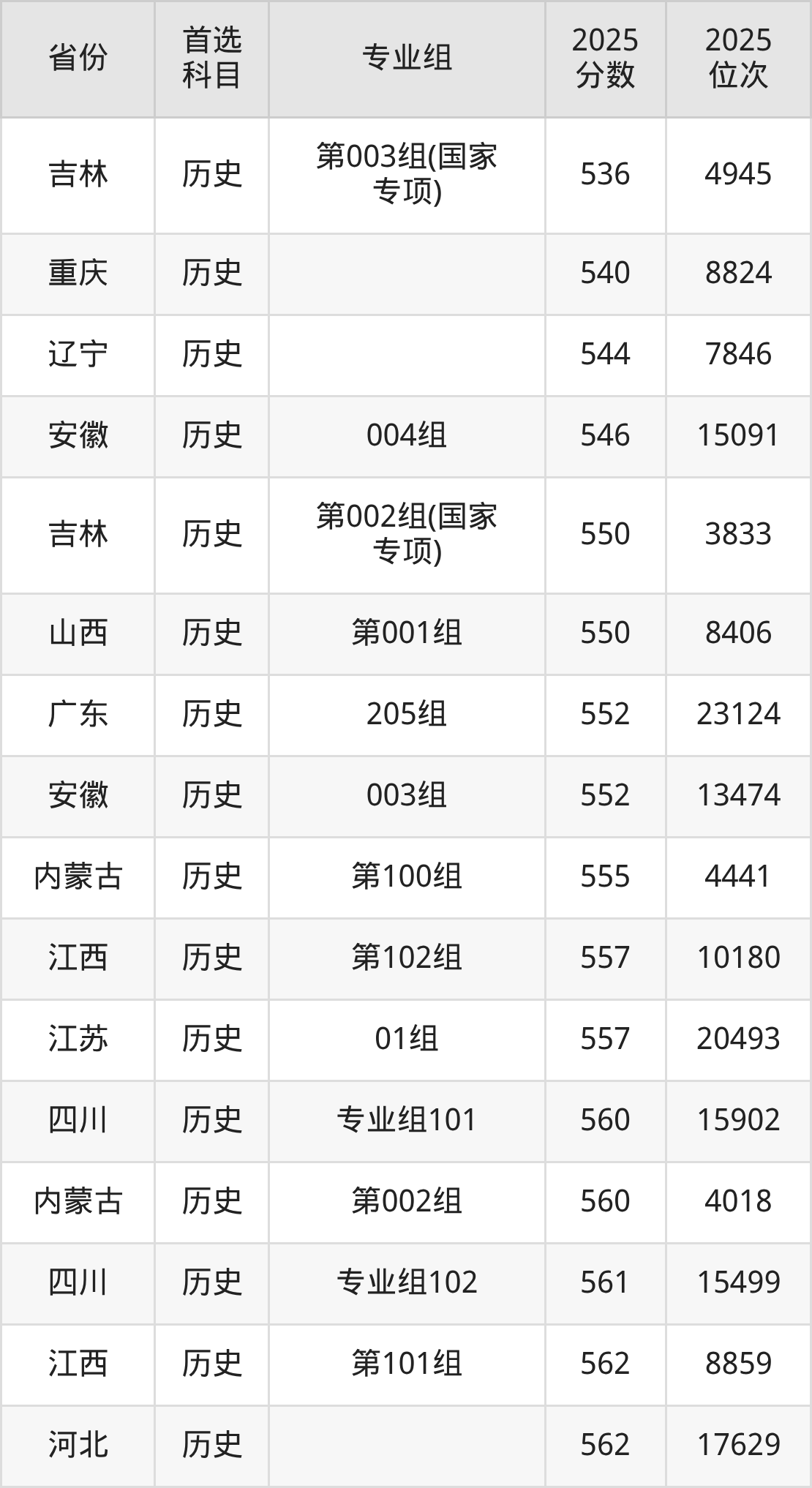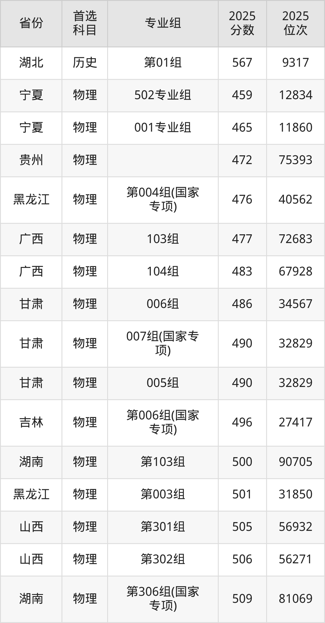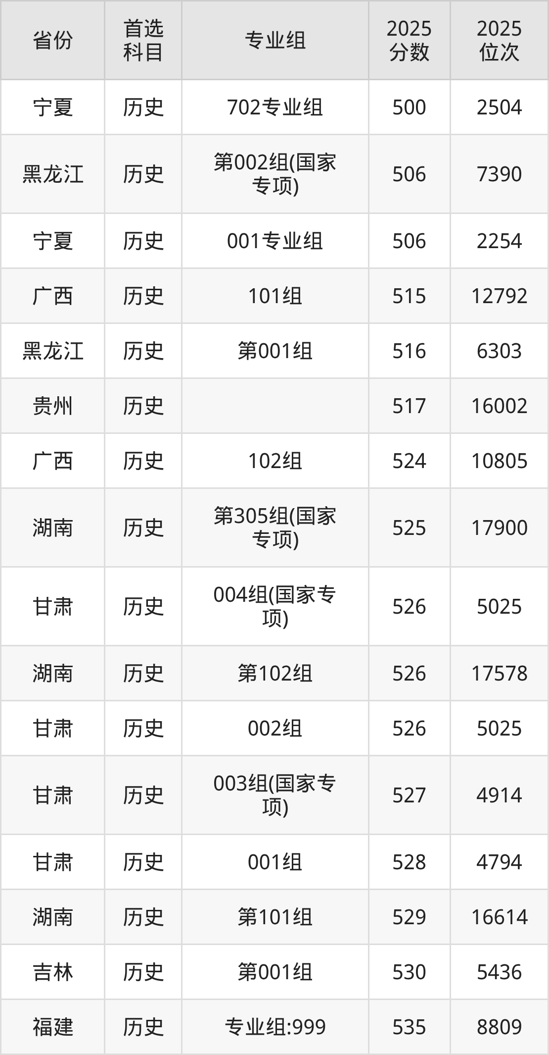 历史类最低分对应地区为宁夏(702专业组),录取位次为2504,超本科B96分;最高分对应地区为湖北(第01组),录取位次为9317,超本科线125分。