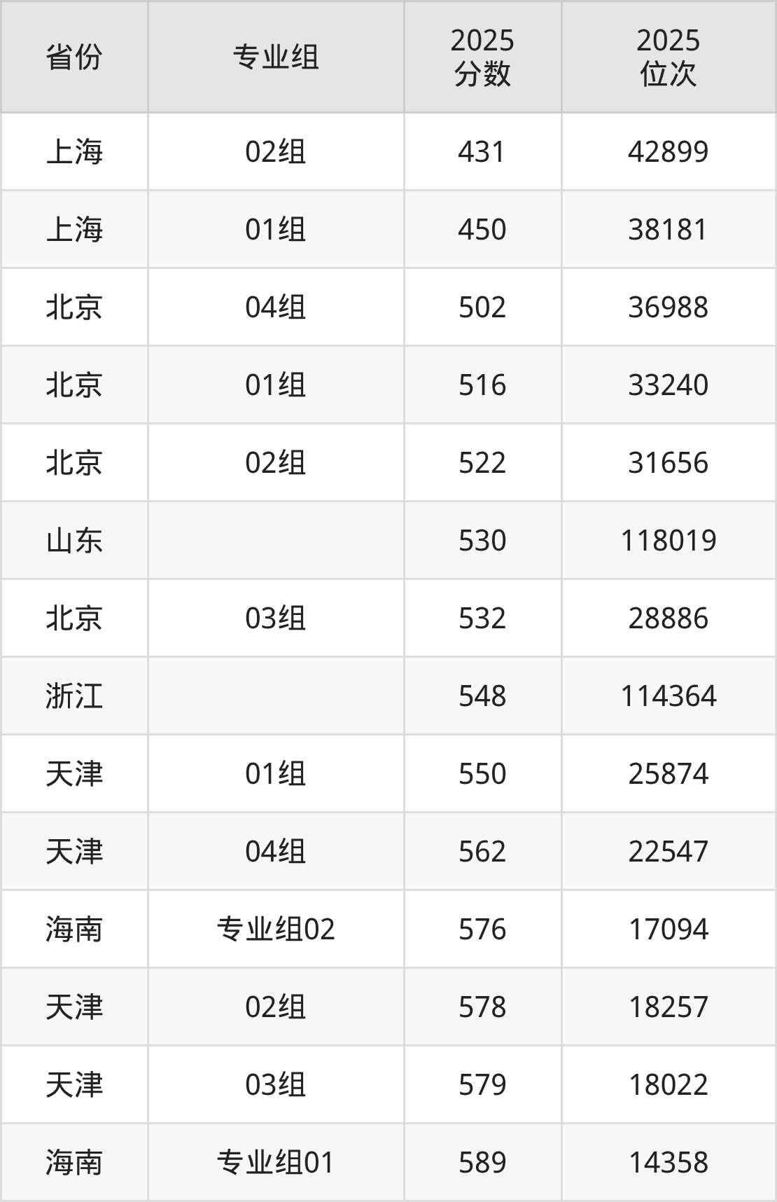 最低分对应地区为上海(02组),录取位次为42899,超本科线29分;最高分对应地区为海南(专业组01),录取位次为14358,超本科线109分。