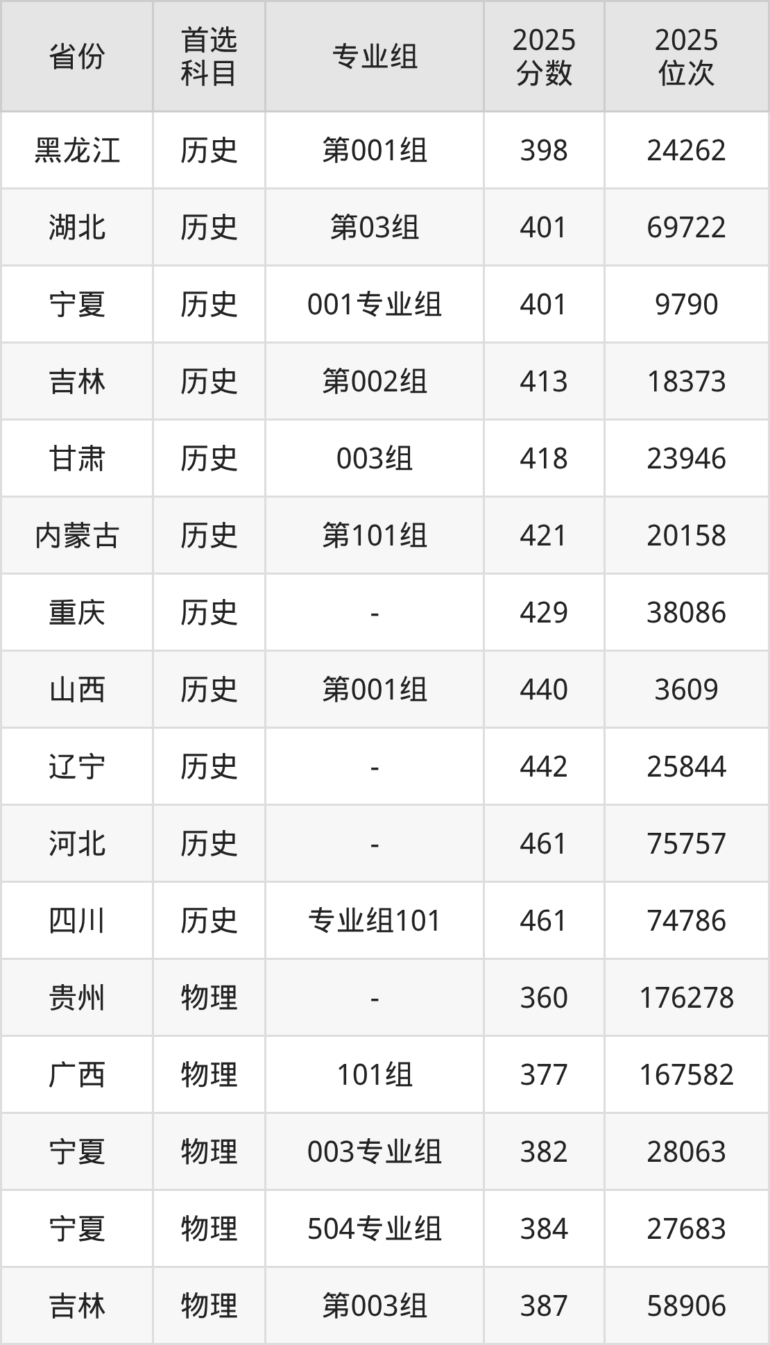历史类最低分对应地区为黑龙江(第001组),录取位次为24262,超专科线238分;最高分对应地区为四川(专业组101),录取位次为74786,超专科线311分。