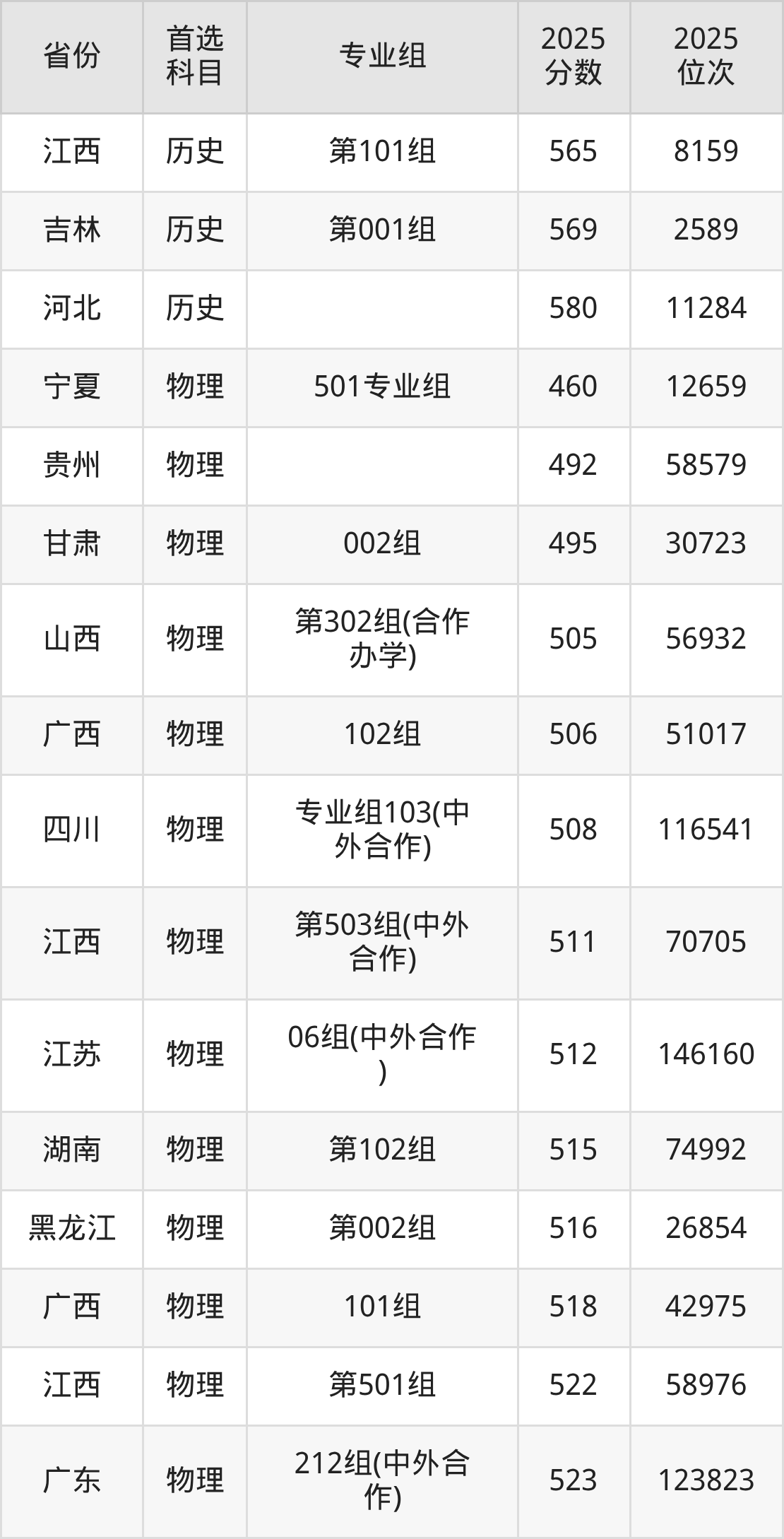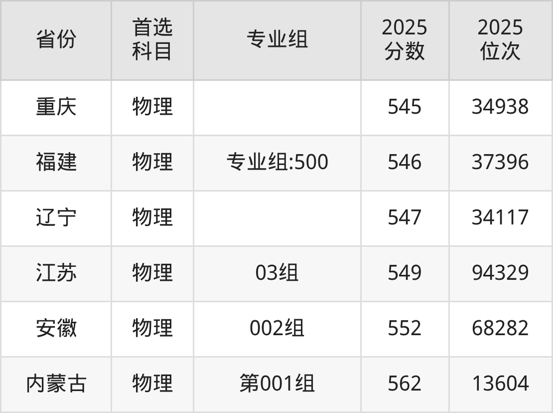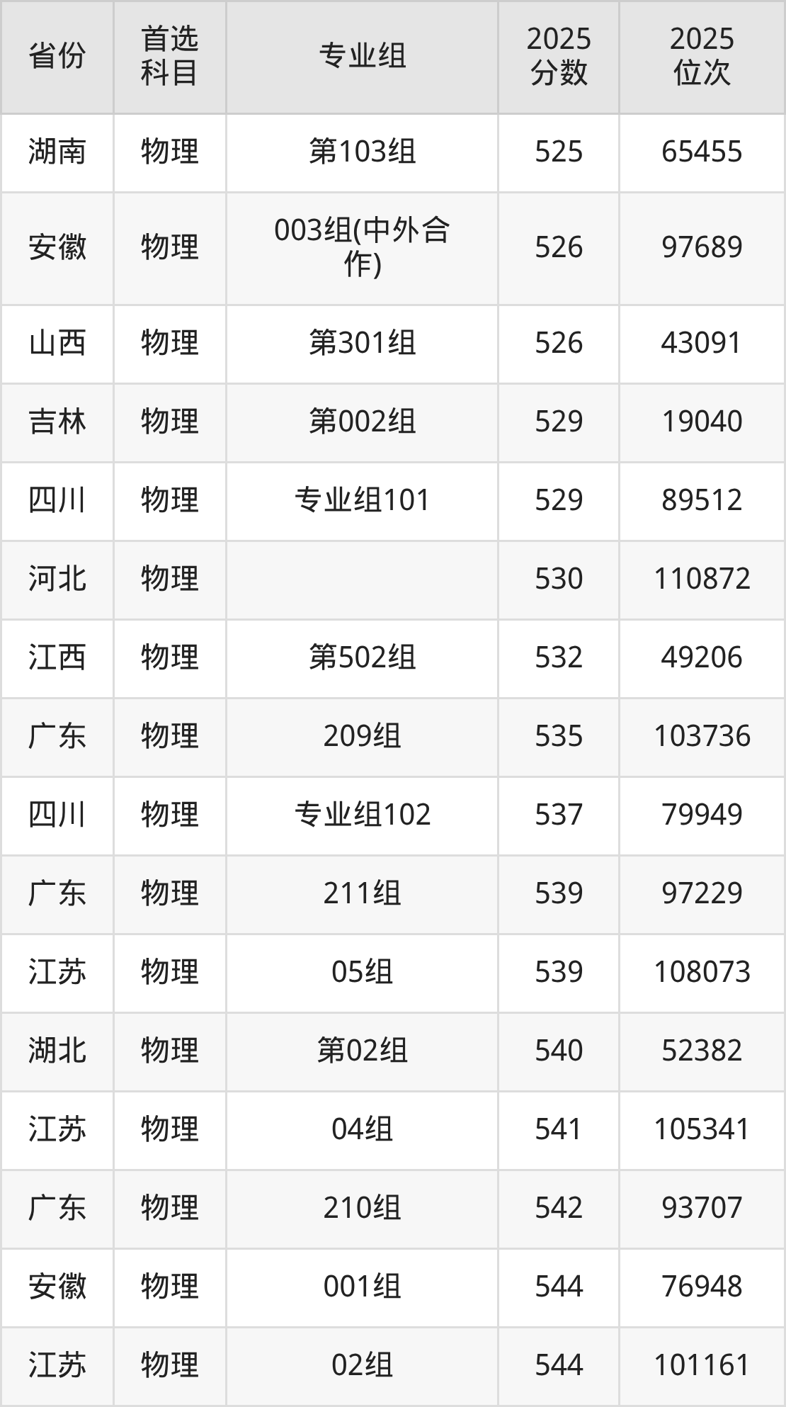 物理类:02组544分、101161名,03组549分、94329名,04组541分、105341名,05组539分、108073名,06组(中外合作)512分、146160名;