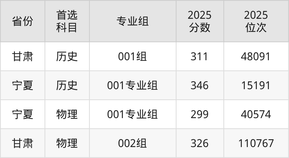物理类最低分对应地区为宁夏(001专业组),录取位次为40574,超专科线149分;最高分对应地区为甘肃(002组),录取位次为110767,超专科线146分。