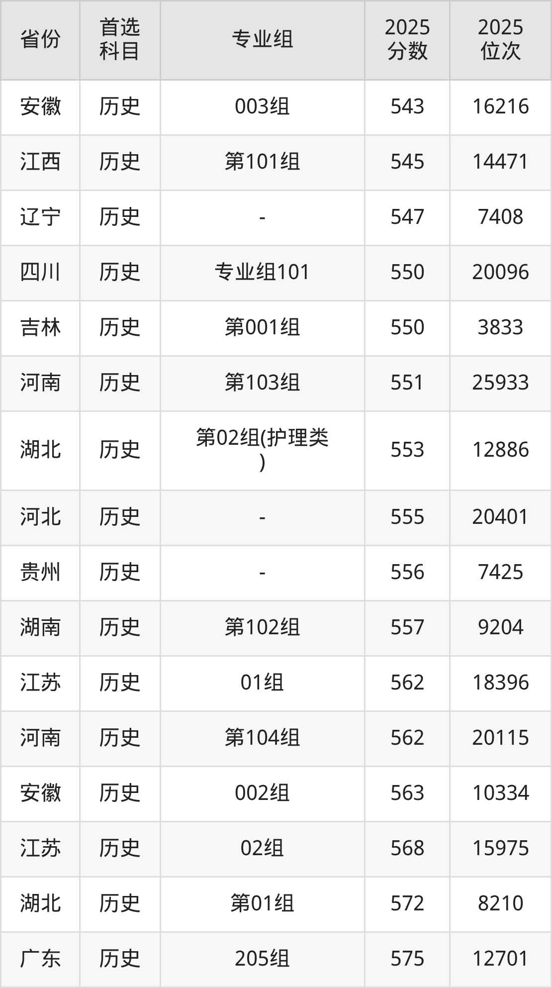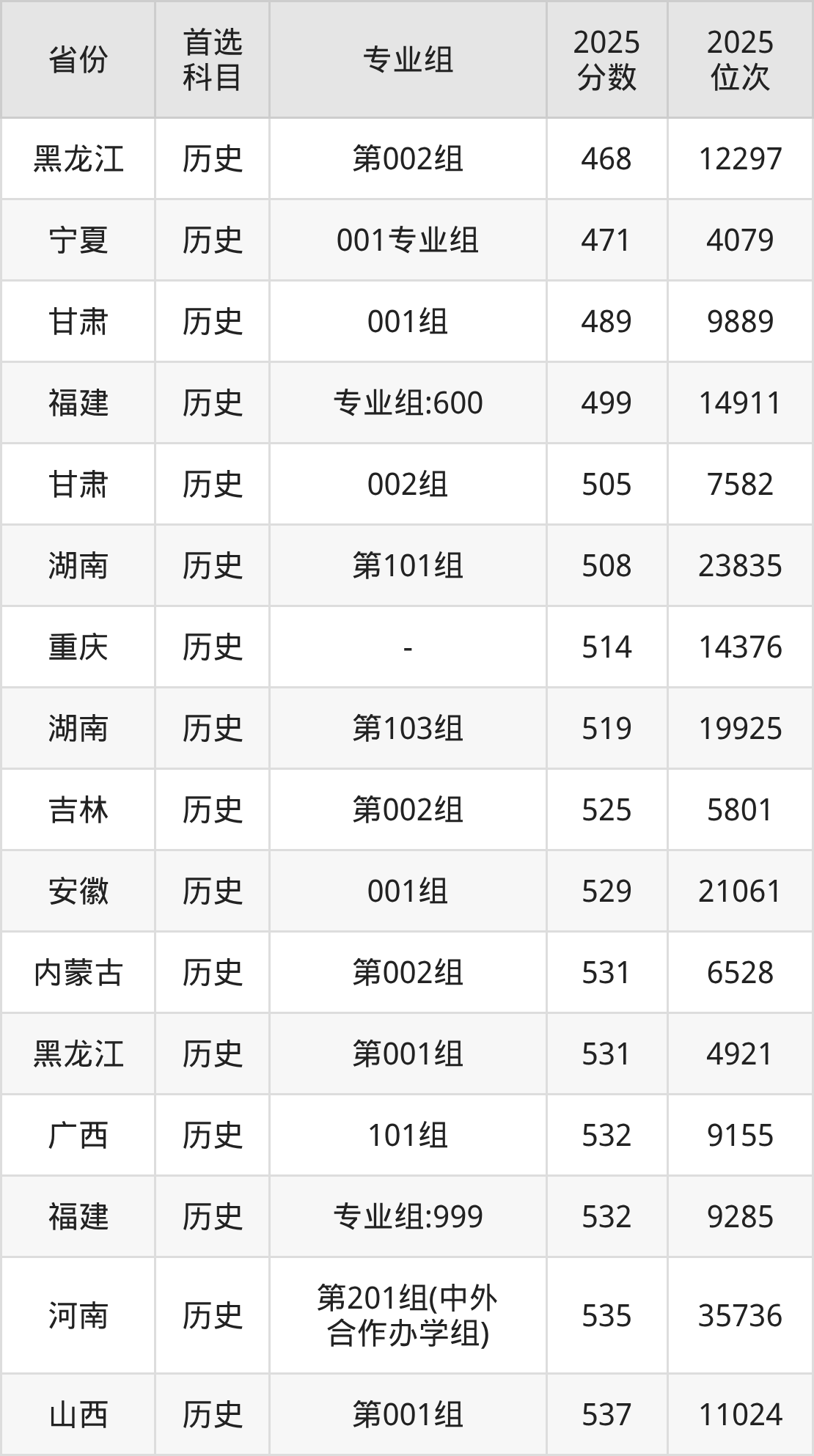历史类最低分对应地区为黑龙江(第002组),录取位次为12297,超本科线63分;最高分对应地区为河南(第101组),录取位次为4141,超本科线139分。