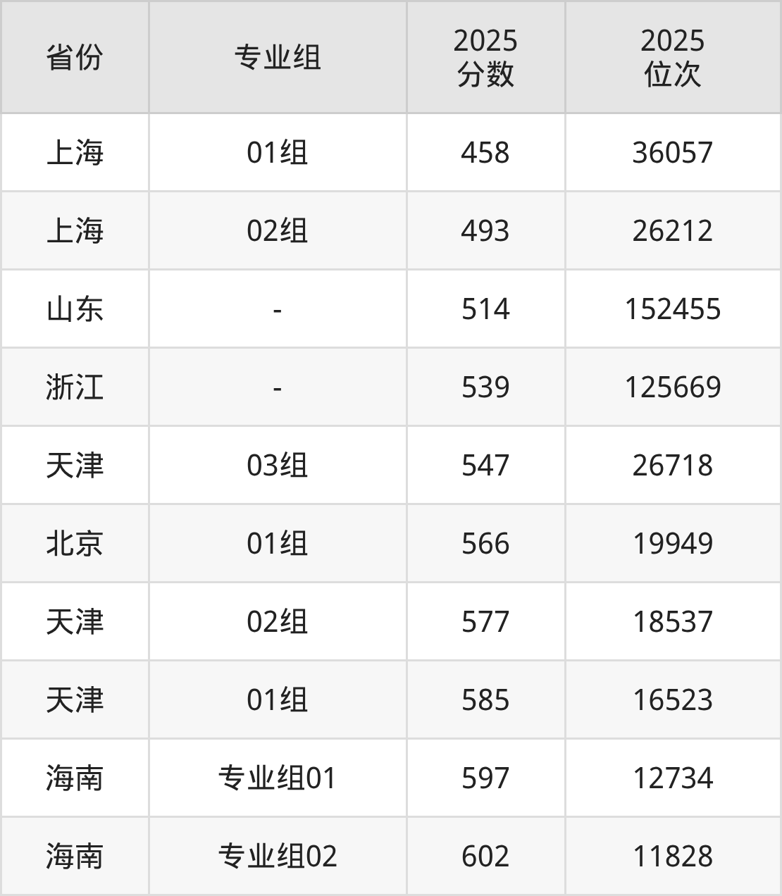最低分对应地区为上海(01组),录取位次为36057,超本科线56分;最高分对应地区为海南(专业组02),录取位次为11828,超本科线122分。