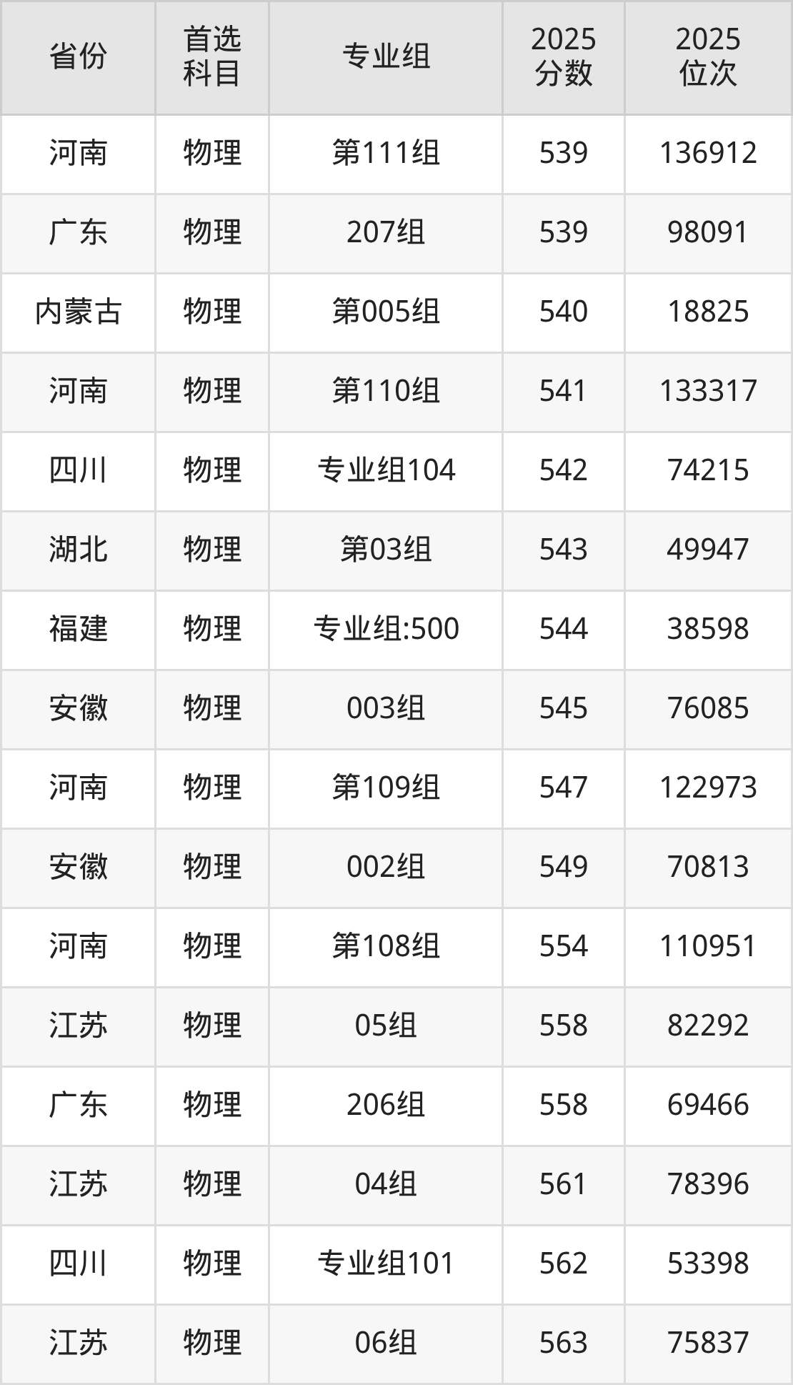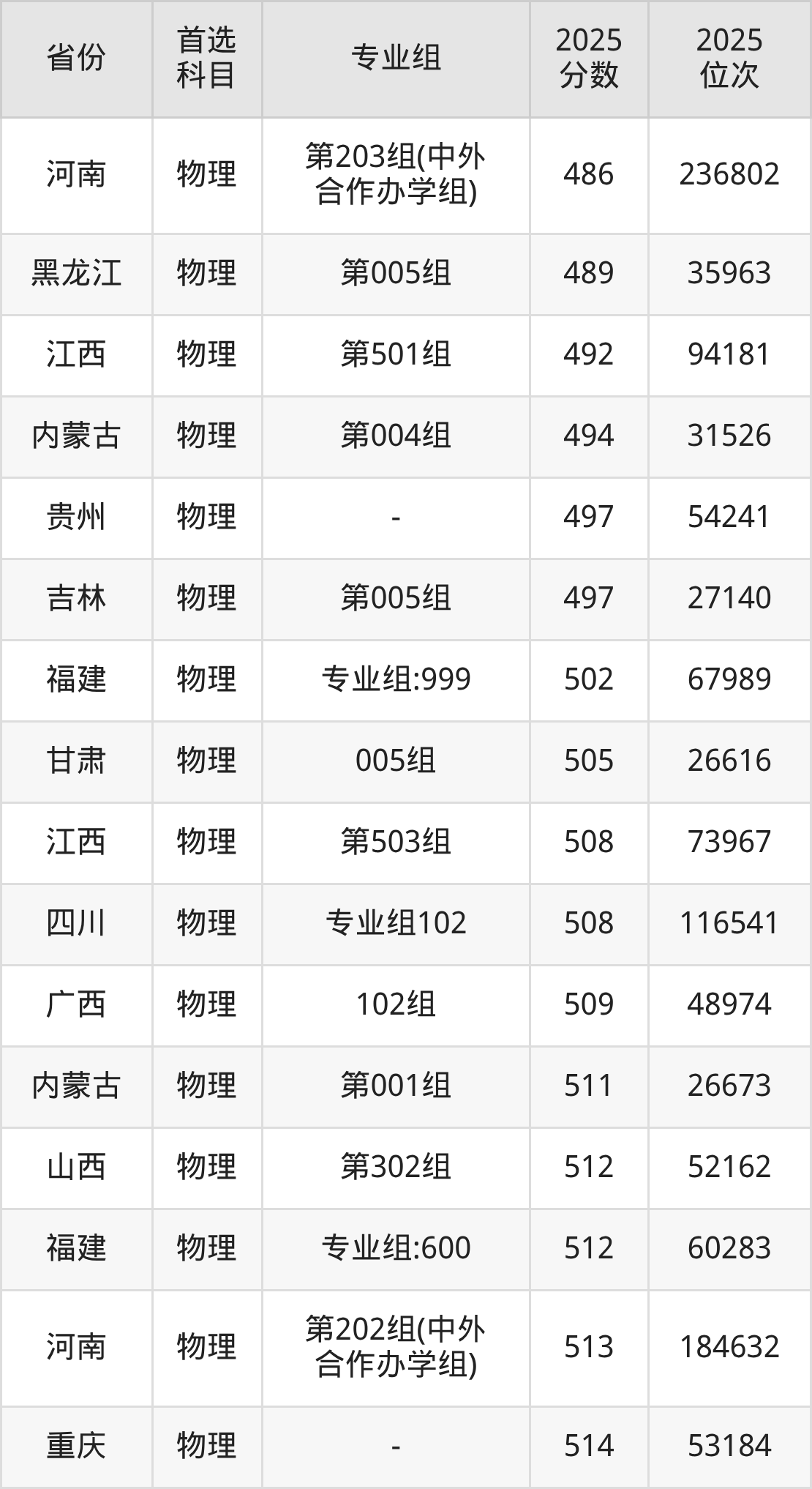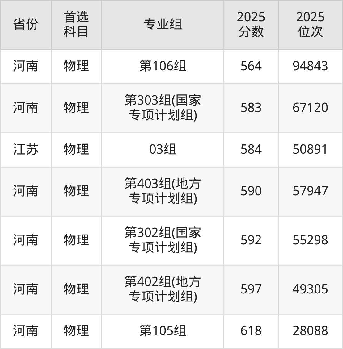 物理类最低分对应地区为宁夏(604专业组),录取位次为16897,超本科B65分;最高分对应地区为河南(第105组),录取位次为28088,超本科线191分。