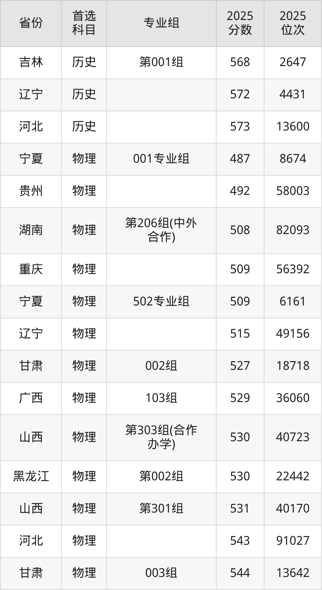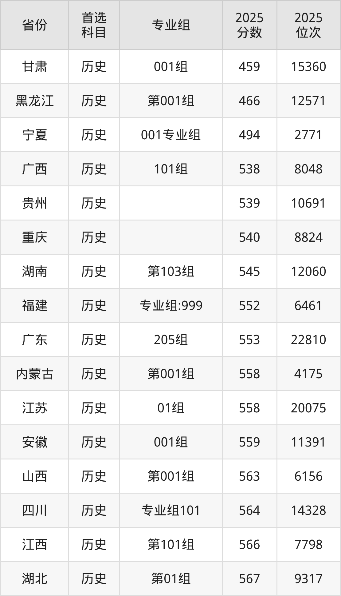 历史类最低分对应地区为甘肃(001组),录取位次为15360,超本科线47分;最高分对应地区为河北,录取位次为13600,超本科线96分。