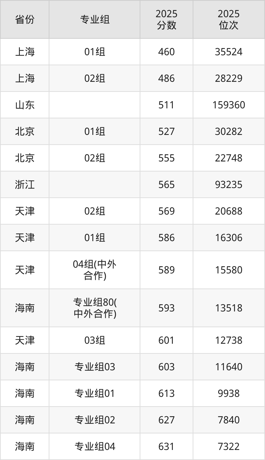 最低分对应地区为上海(01组),录取位次为35524,超本科线58分;最高分对应地区为海南(专业组04),录取位次为7322,超本科线151分。