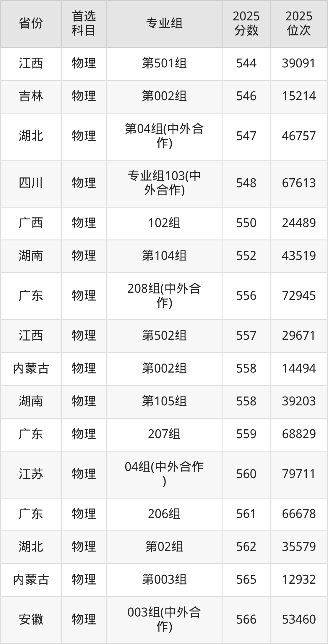 物理类:第106组561分、34562名,第207组(中外合作)540分、48436名,第208组(中外合作)444分、138010名。
