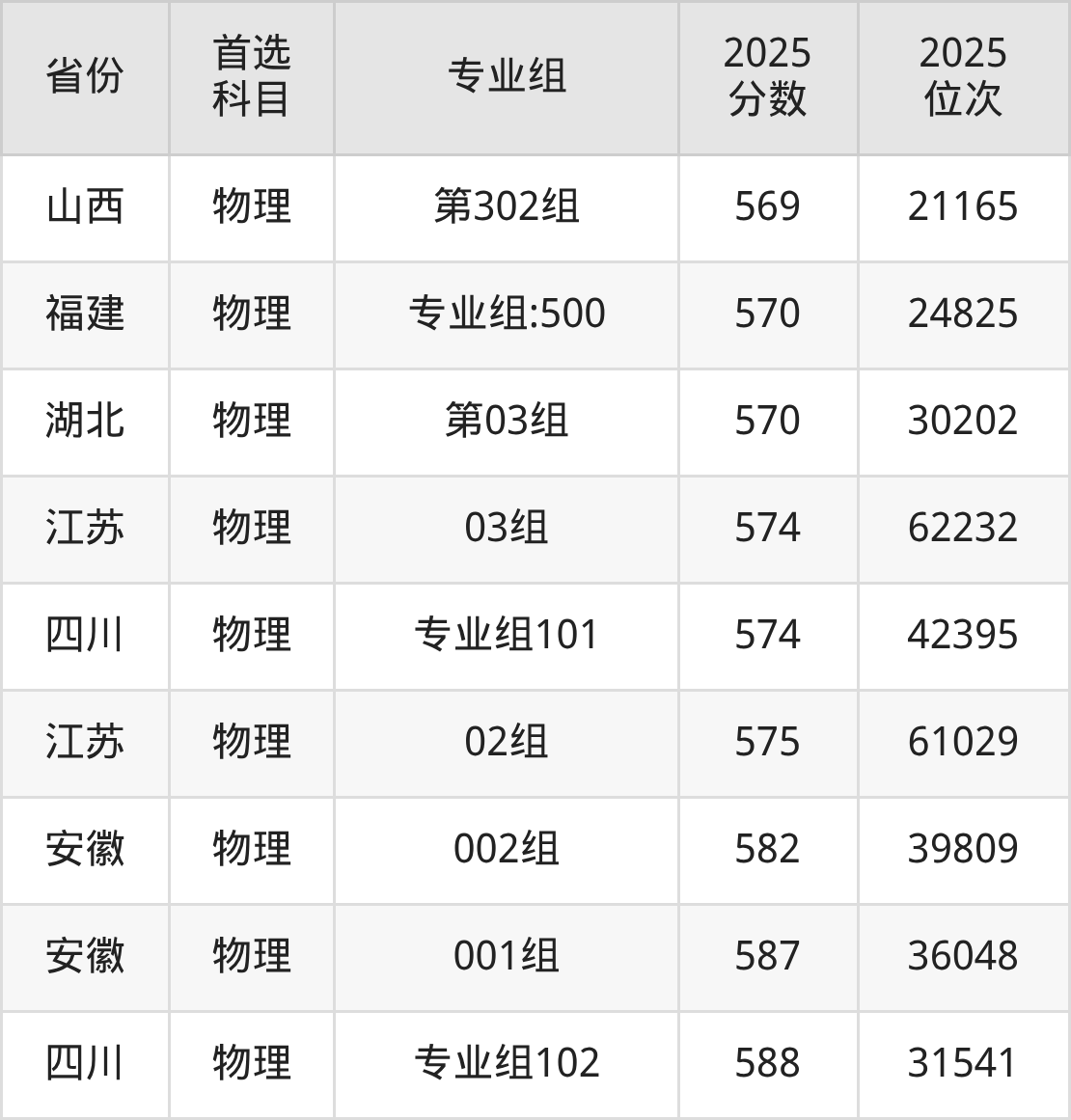 物理类最低分对应地区为宁夏(001专业组),录取位次为8674,超本科B115分;最高分对应地区为四川(专业组102),录取位次为31541。