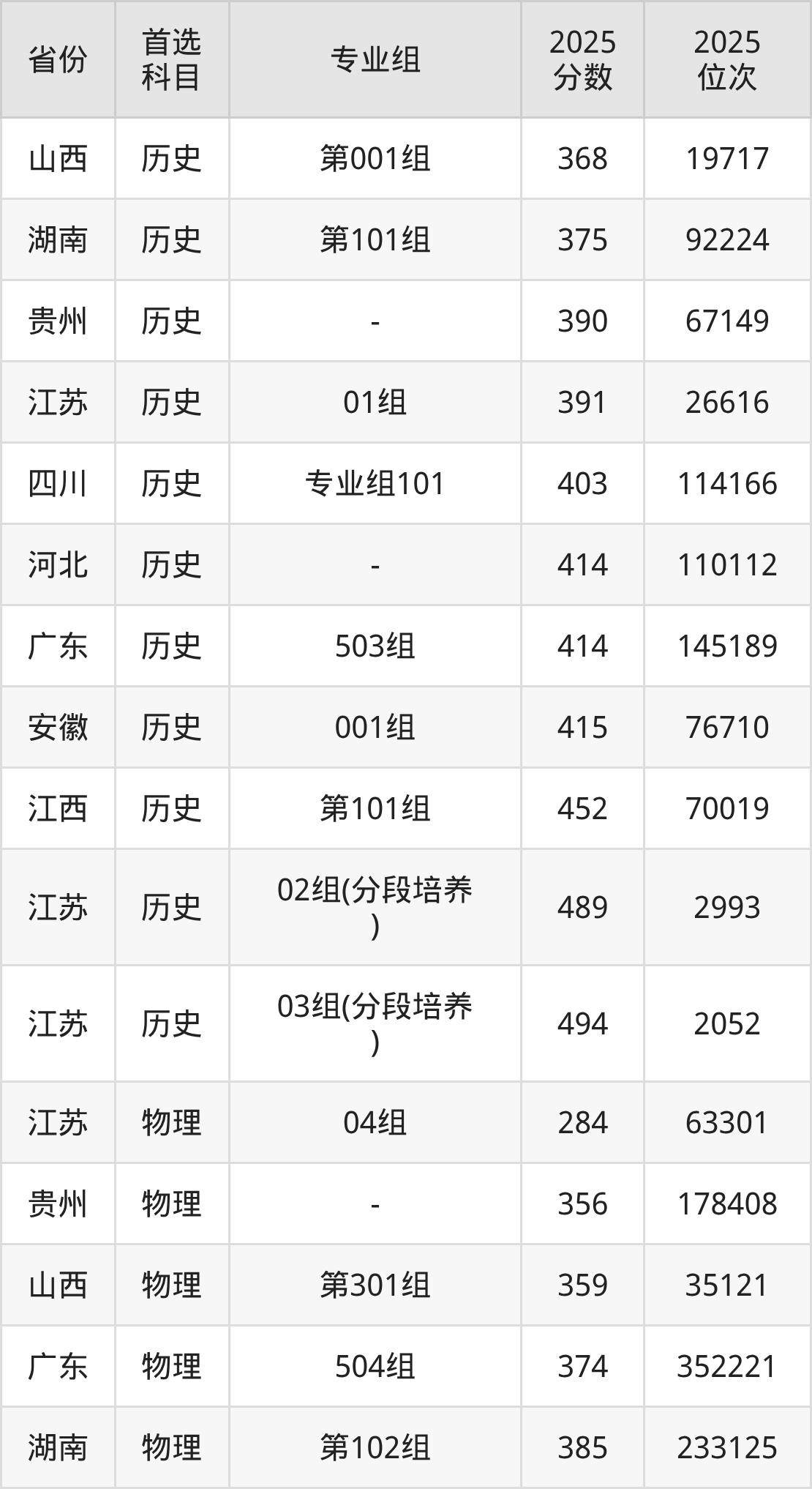 历史类最低分对应地区为山西(第001组),录取位次为19717,超专科线268分;最高分对应地区为江苏(03组(分段培养)),录取位次为2052,超专科线274分。