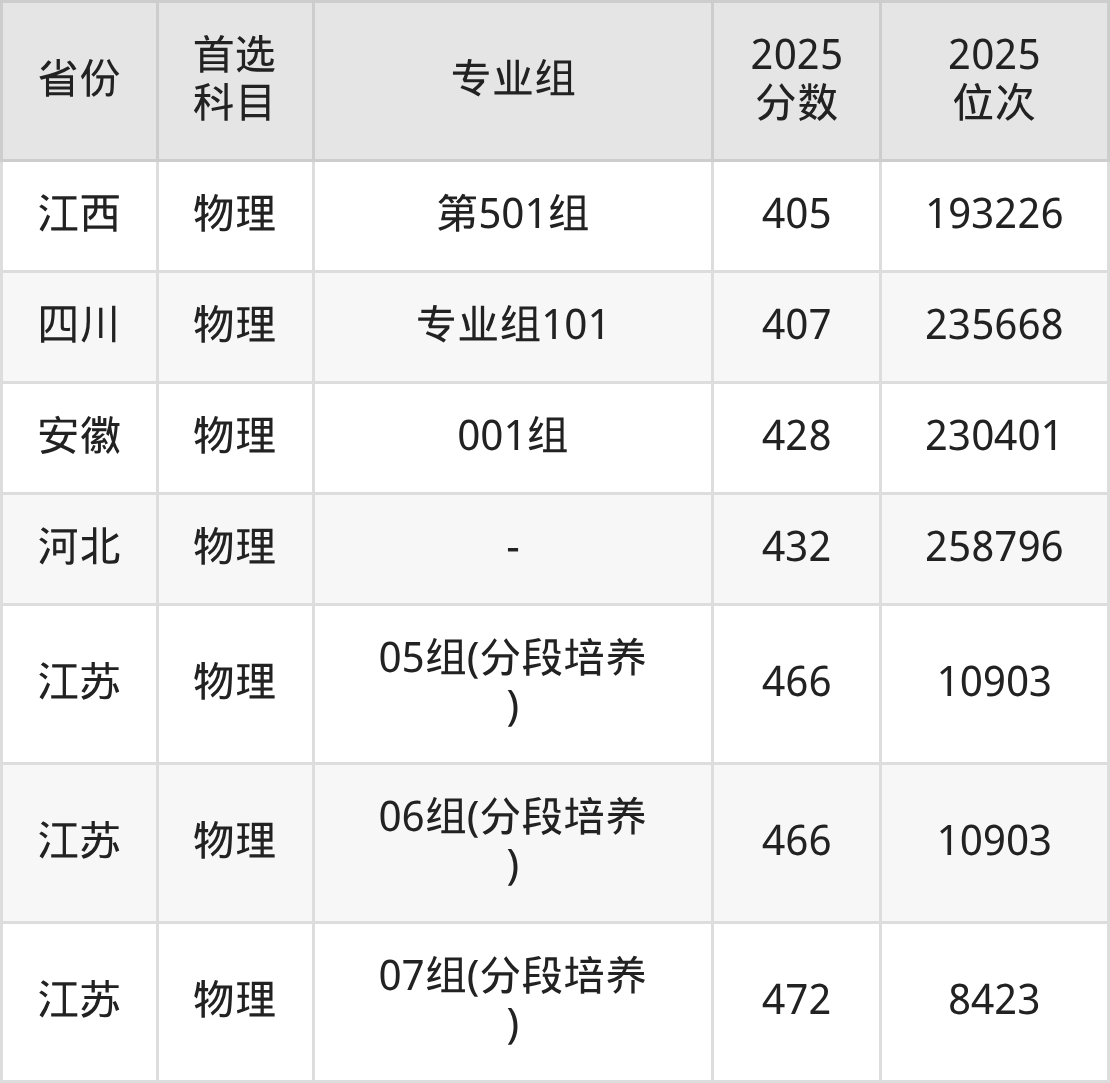 物理类:04组284分、63301名,05组(分段培养)466分、10903名,06组(分段培养)466分、10903名,07组(分段培养)472分、8423名;