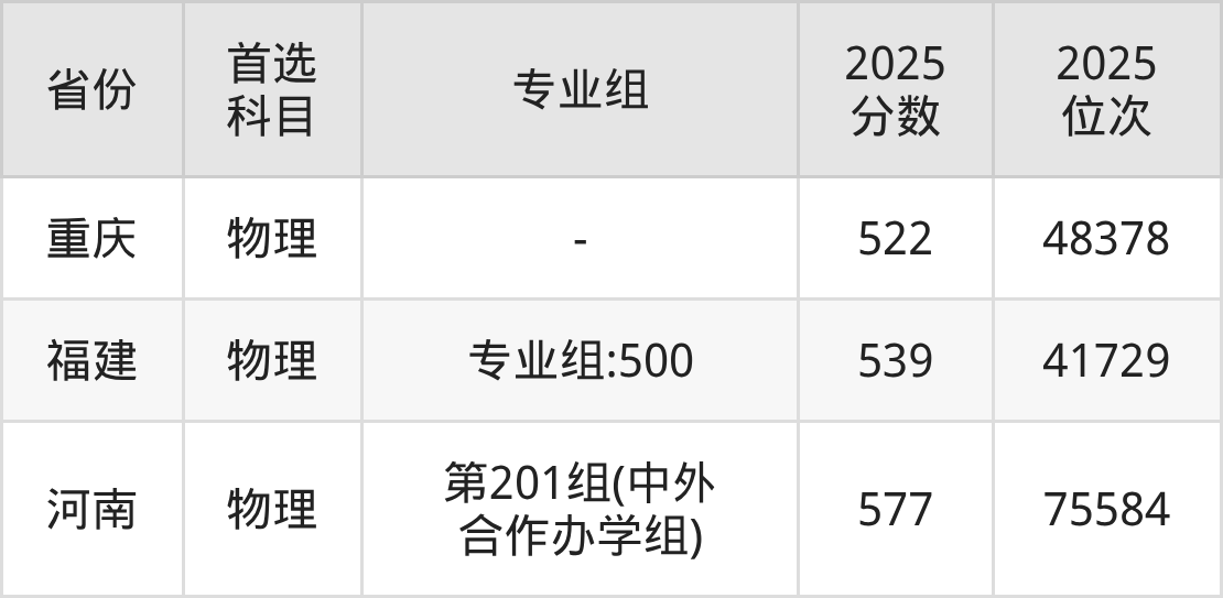 物理类最低分对应地区为重庆,录取位次为48378,超本科线97分;最高分对应地区为河南(第201组(中外合作办学组)),录取位次为75584。