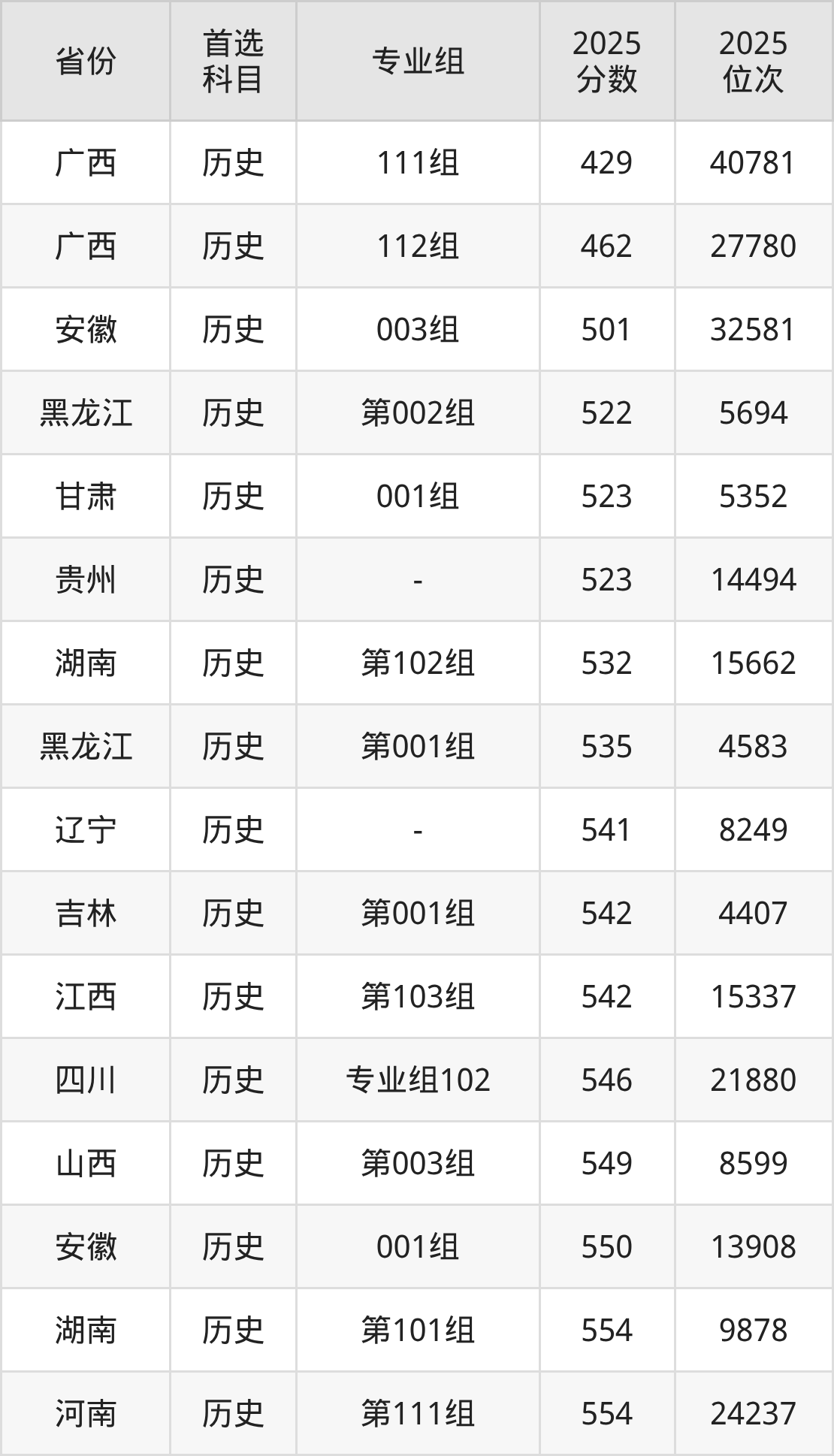 历史类最低分对应地区为广西(111组),录取位次为40781,超本科线27分;最高分对应地区为河北,录取位次为11592,超本科线102分。