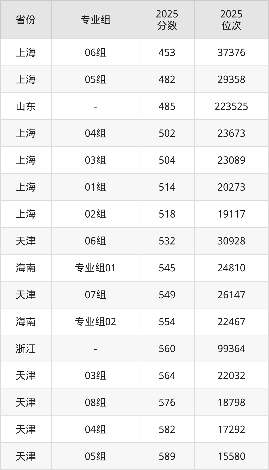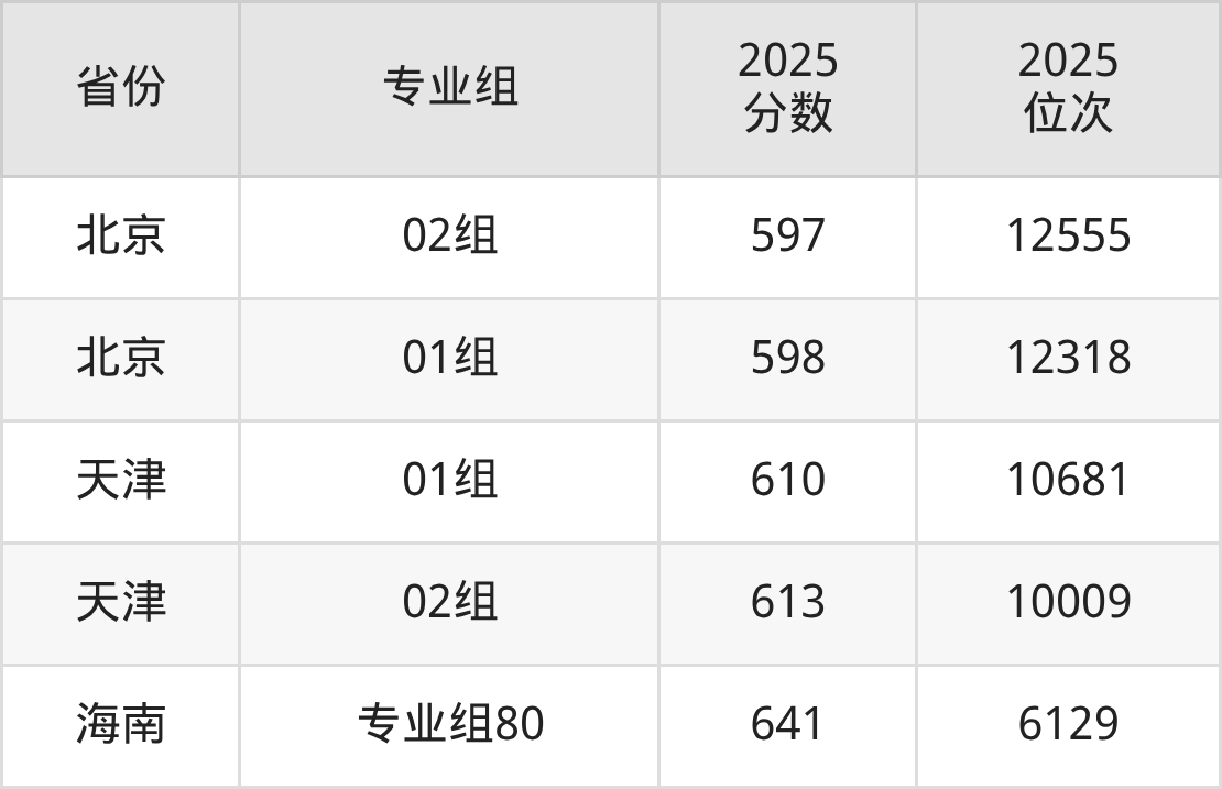 最低分对应地区为上海(06组),录取位次为37376,超本科线51分;最高分对应地区为海南(专业组80),录取位次为6129,超本科线161分。