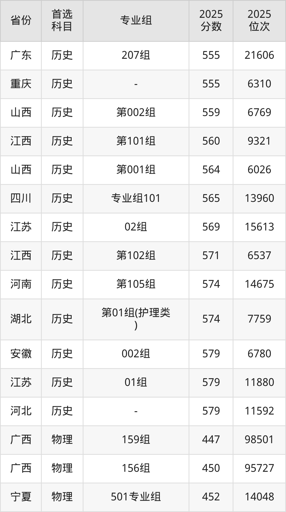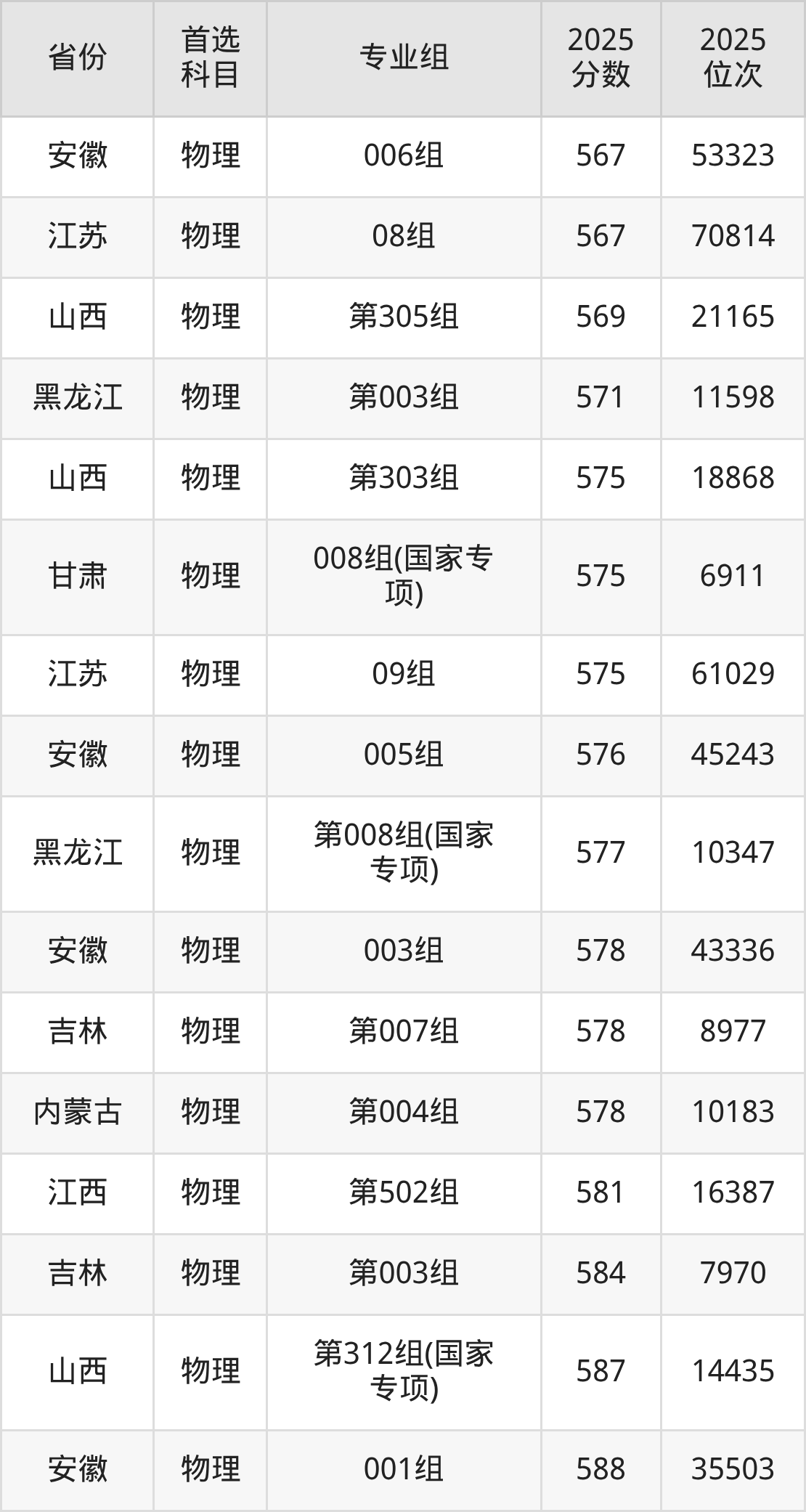物理类:第003组571分、11598名,第004组558分、14739名,第005组533分、21497名,第006组554分、15759名,第007组531分、22130名,第008组(国家专项)577分、10347名;