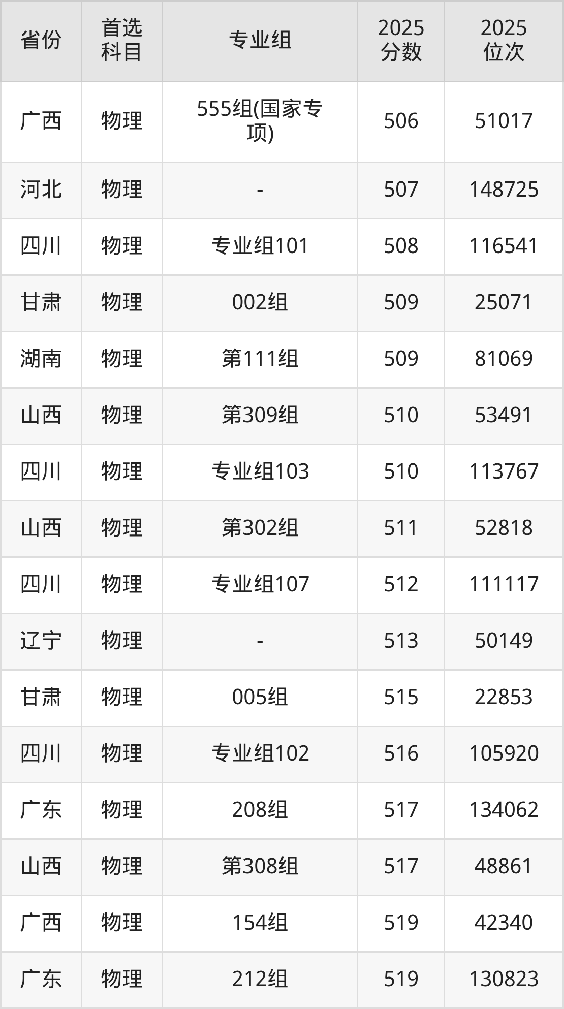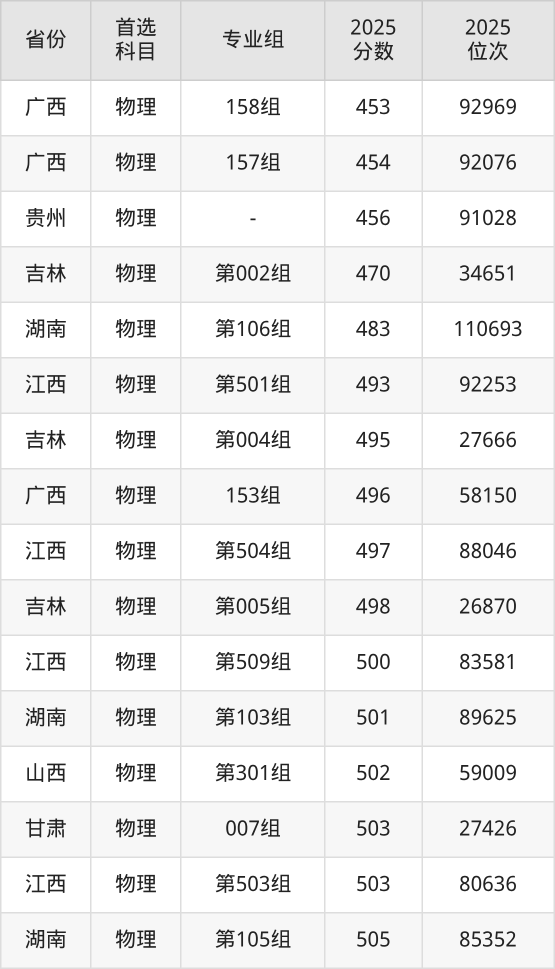 物理类最低分对应地区为广西(159组),录取位次为98501,超本科线77分;最高分对应地区为河南(第306组(国家专项计划组)),录取位次为25611,超本科线194分。