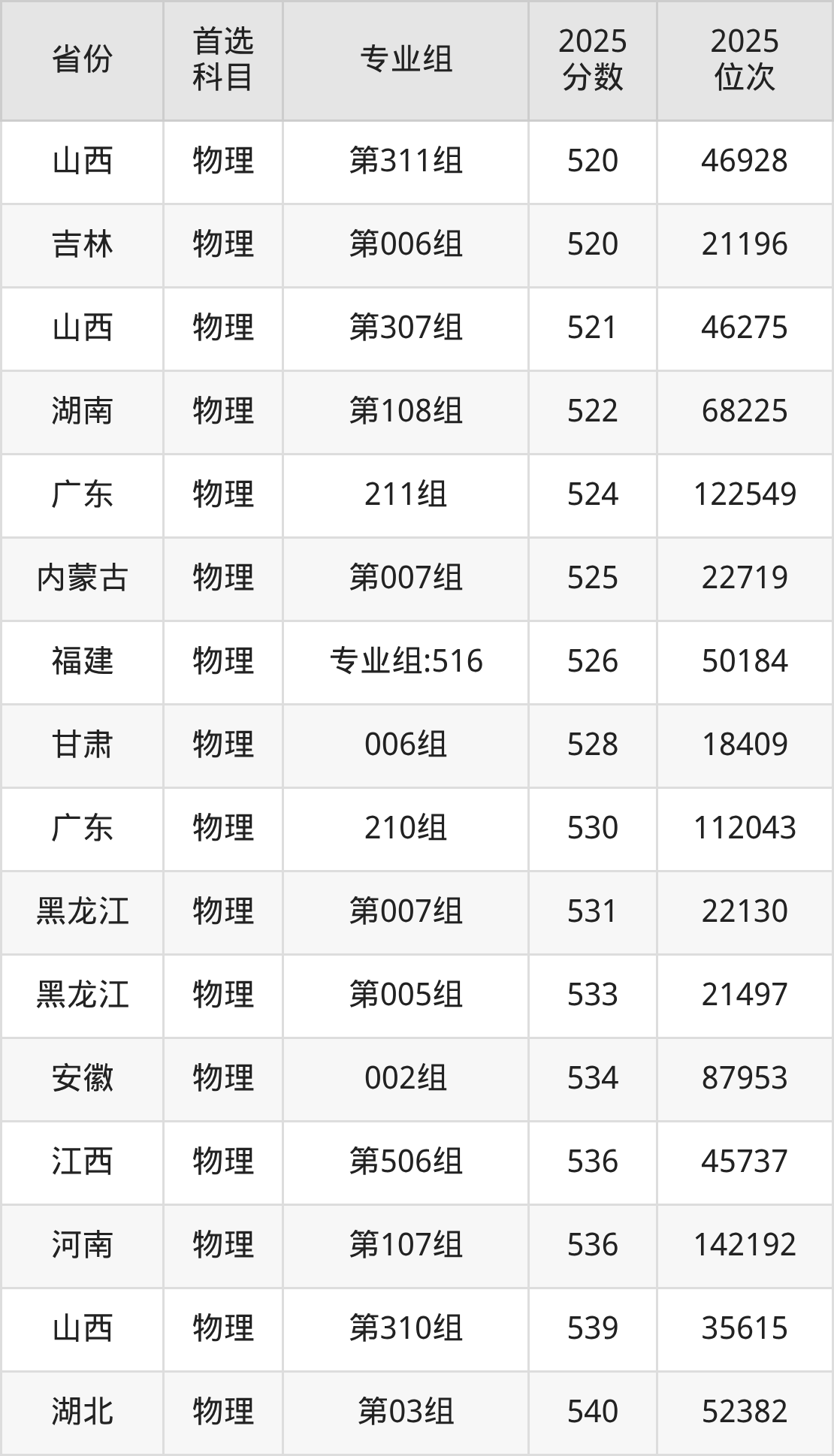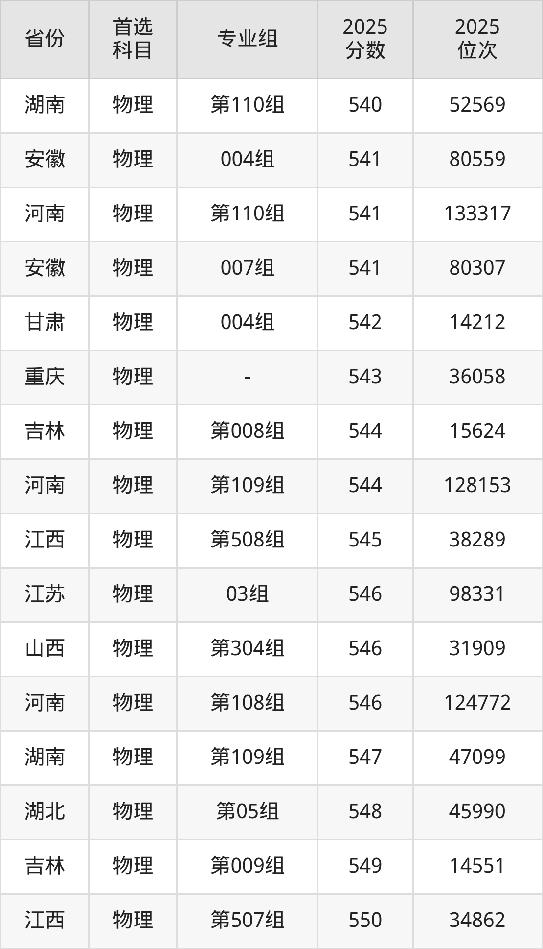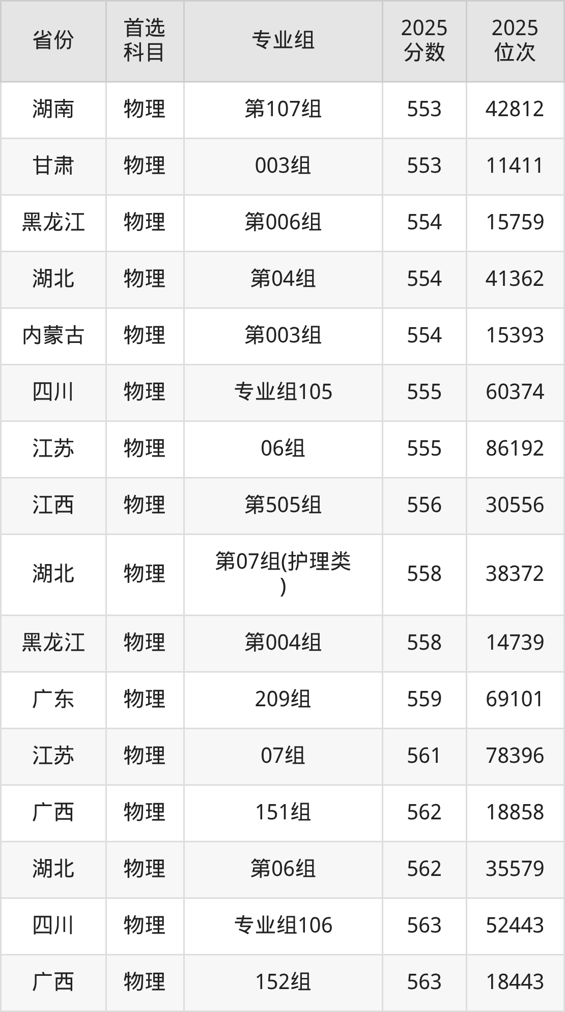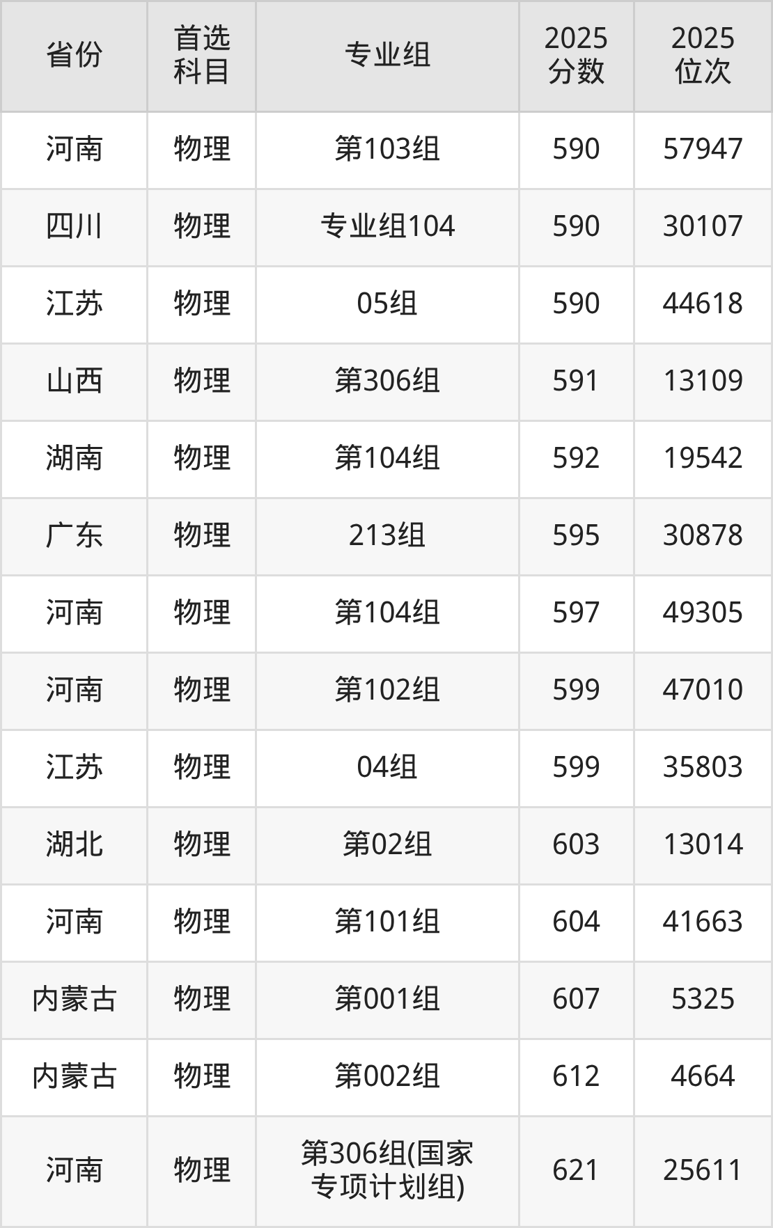 物理类:第003组(国家专项)594分、9826名,第004组589分、10843名,第005组594分、9826名,第006组550分、19799名,第007组558分、17749名,第008组535分、23987名;