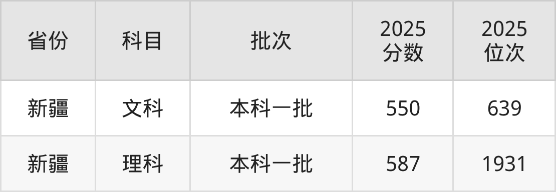 文科最低分对应地区为新疆,录取位次为639,超一本线99分。