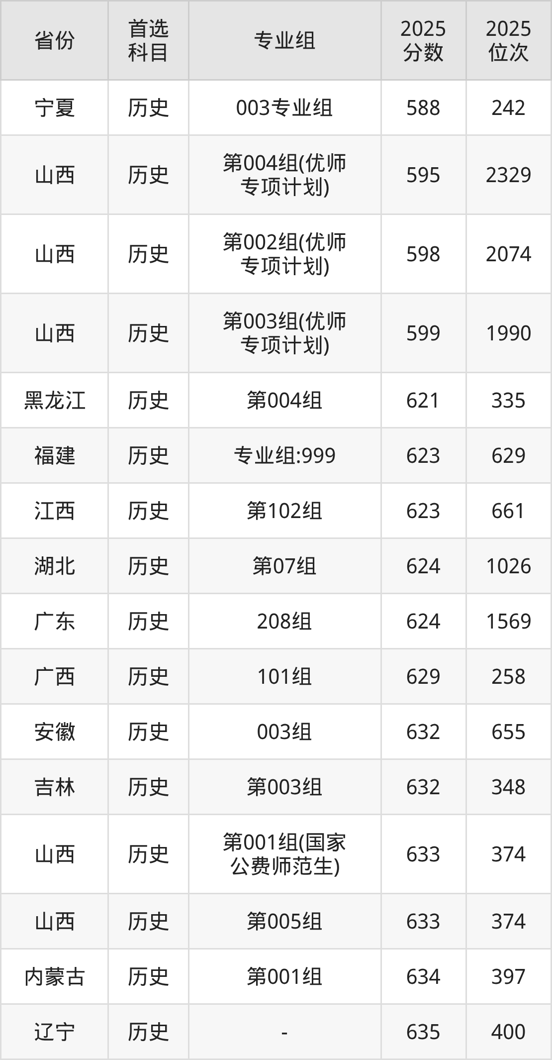 历史类:101组(国家免费师范生)618分、1564名,103组(国家免费师范生)615分、1787名,201组621分、1334名;