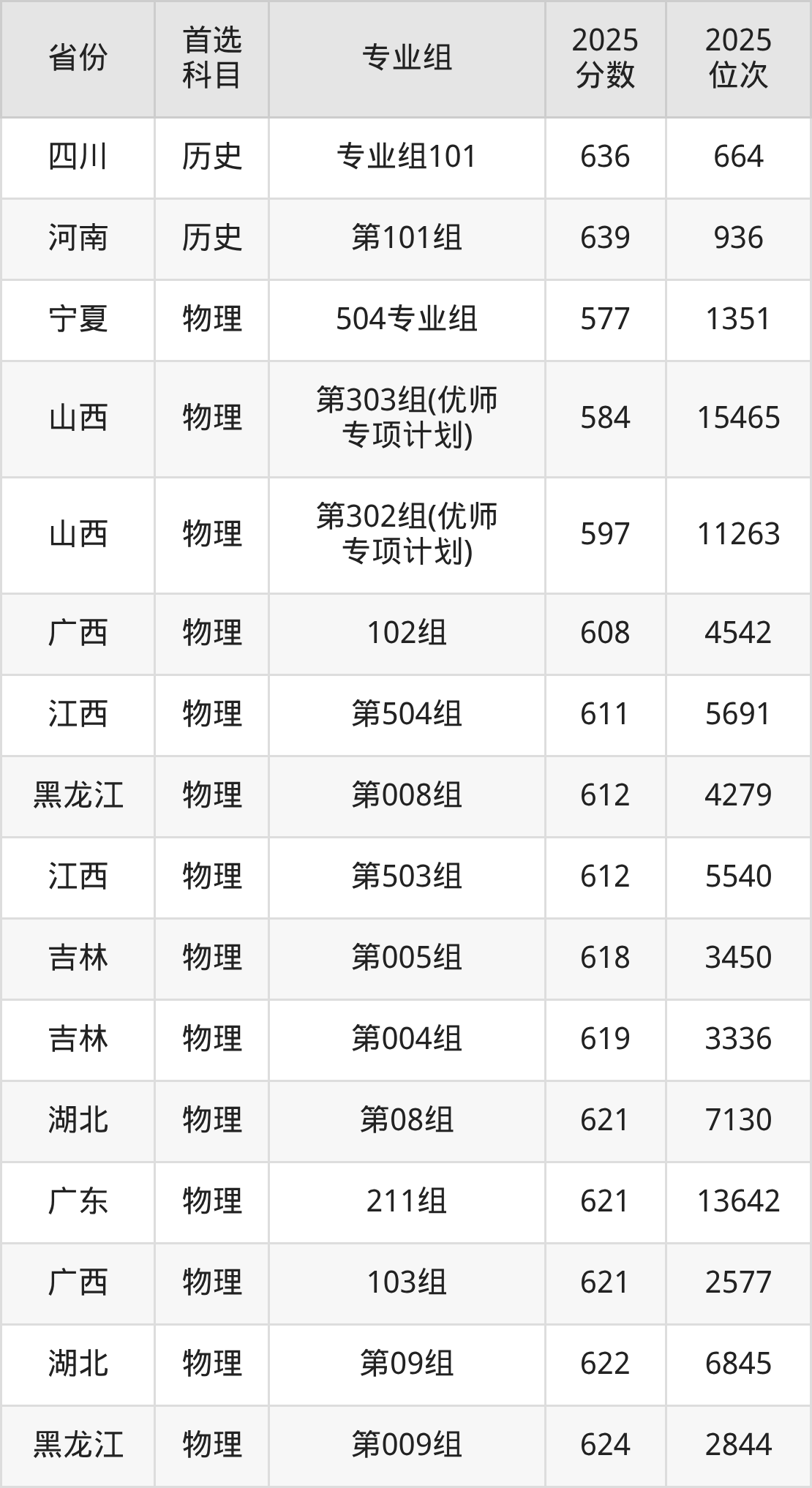 物理类:104组(国家免费师范生)633分、9274名,106组(国家免费师范生)630分、10462名,202组630分、10462名,203组627分、11762名。