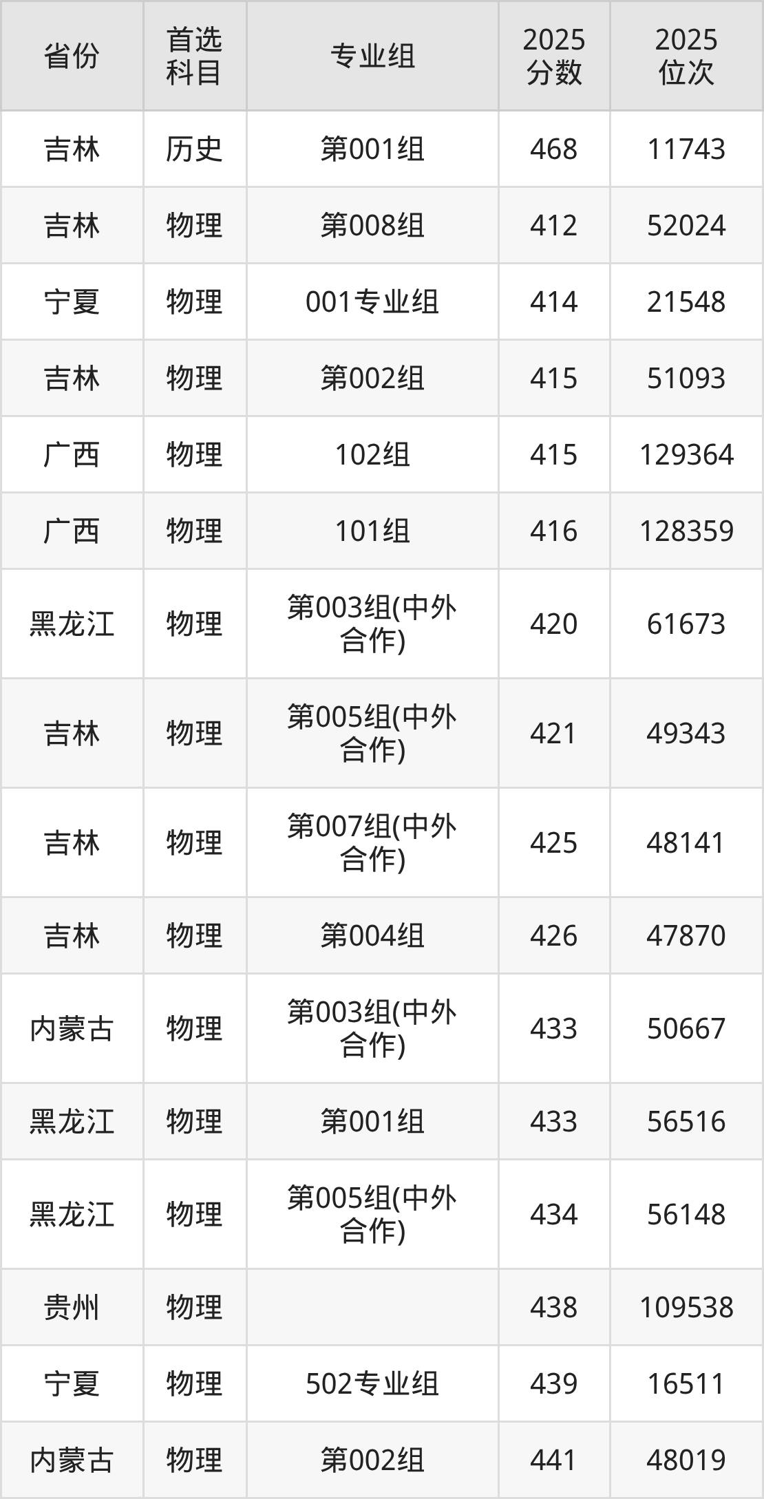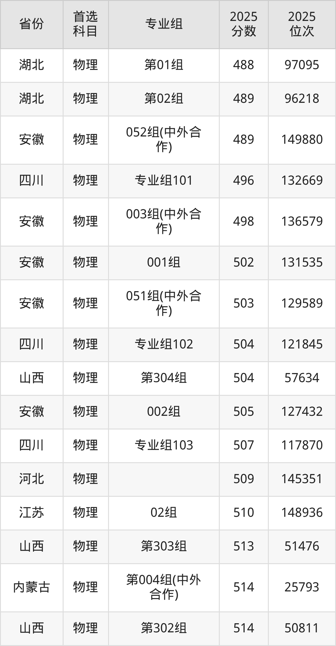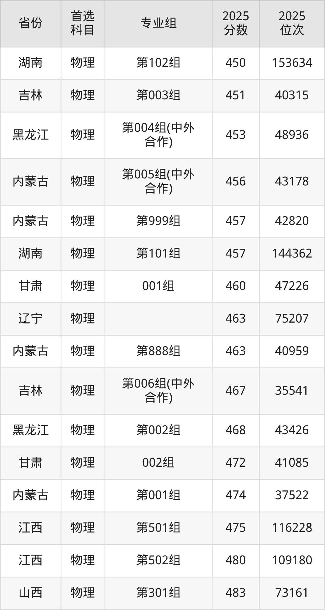 物理类:第002组415分、51093名,第003组451分、40315名,第004组426分、47870名,第005组(中外合作)421分、49343名,第006组(中外合作)467分、35541名,第007组(中外合作)425分、48141名,第008组412分、52024名;