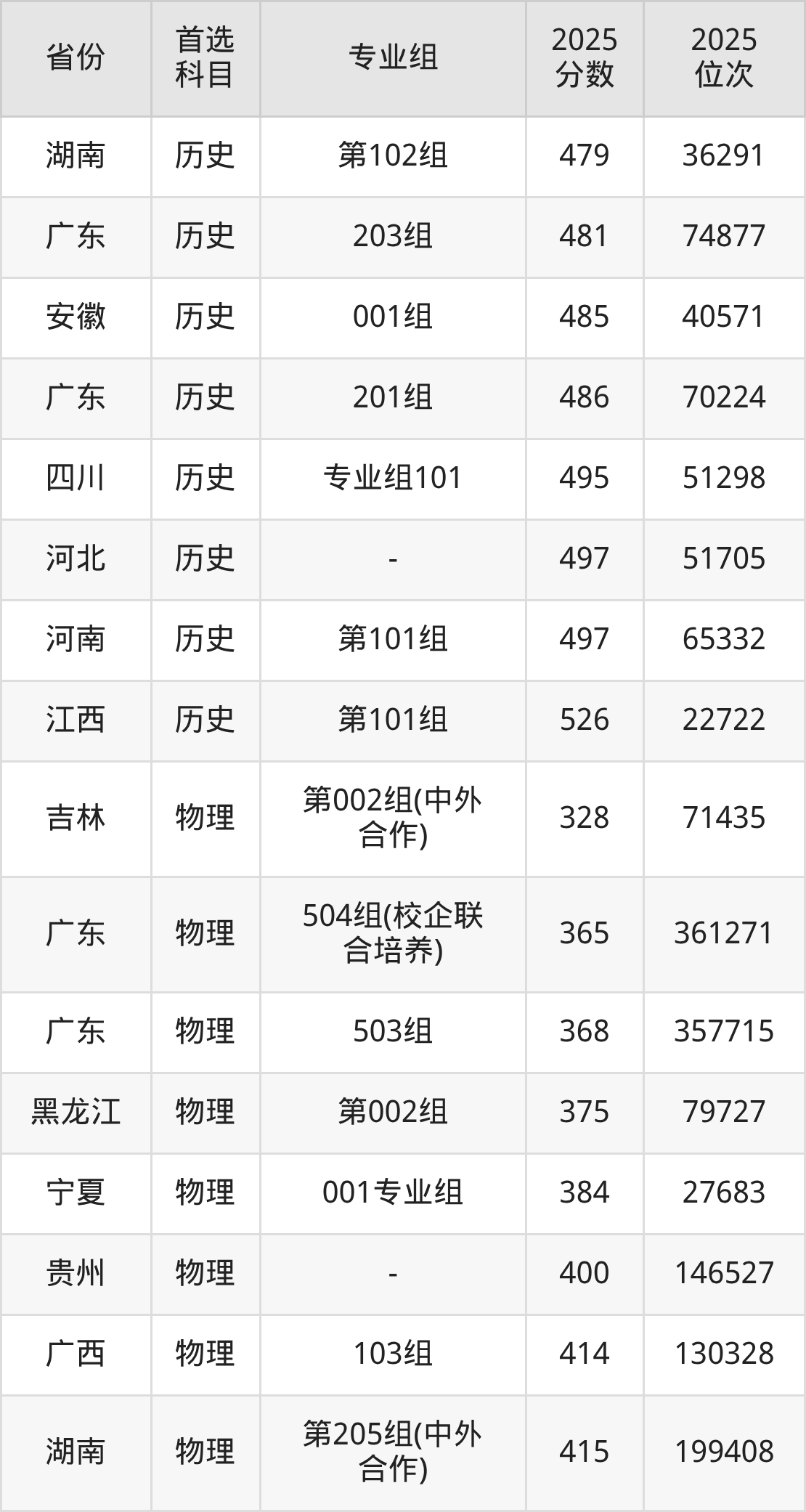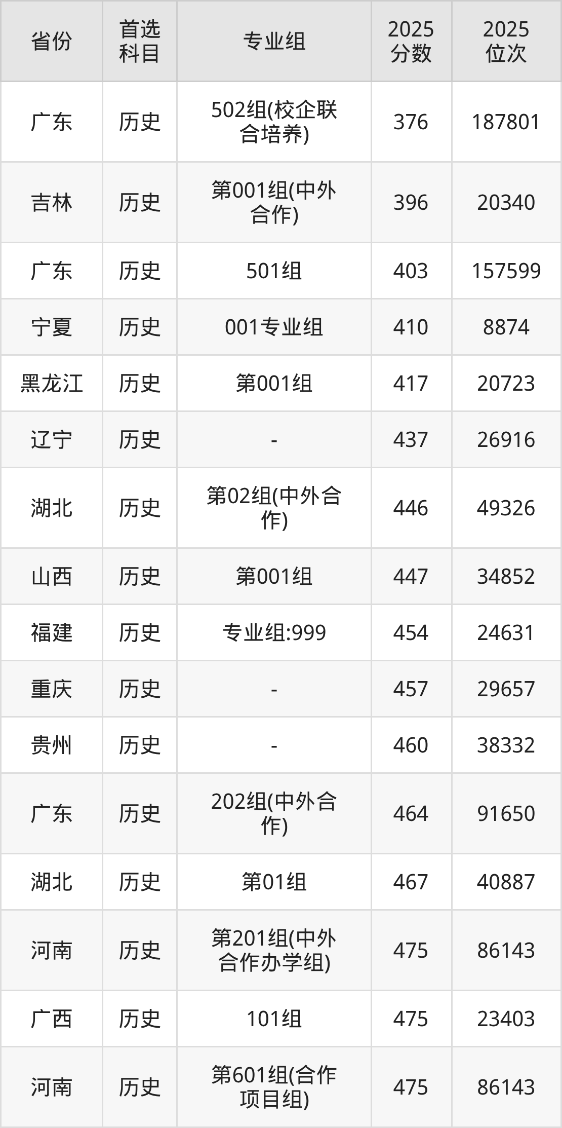 历史类:201组460分、68111名,202组(中外合作/联合培养)435分、89473名,203组446分、79135名,501组353分、173066名,502组(校企联合培养)336分、190892名;