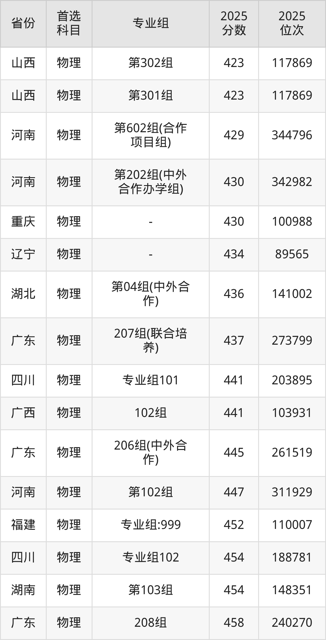 物理类最低分对应地区为吉林(第002组(中外合作)),录取位次为71435,低本科线12分;最高分对应地区为河南(第103组),录取位次为254511。