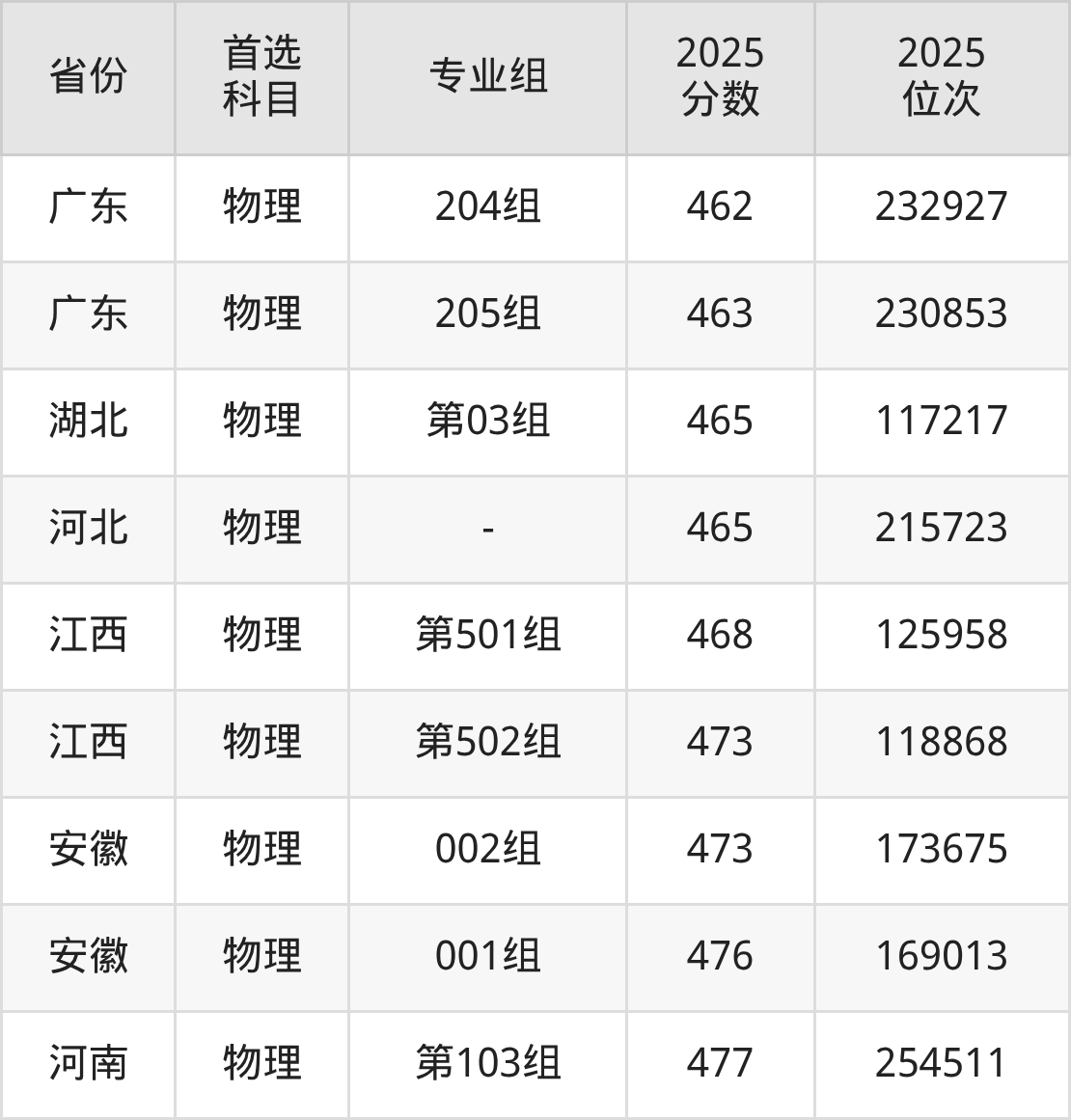 物理类:204组462分、216808名,205组464分、213090名,206组(中外合作/联合培养)447分、244753名,207组(联合培养)449分、240076名,208组458分、223703名,503组381分、342960名,504组(校企联合培养)382分、342597名;
