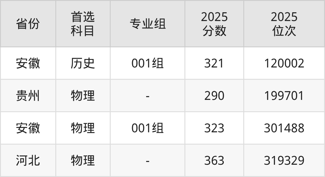 历史类最低分对应地区为安徽(001组),录取位次为120002,超专科线121分。