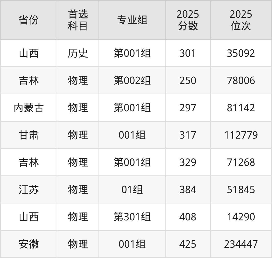 物理类最低分对应地区为吉林(第002组),录取位次为78006;最高分对应地区为安徽(001组),录取位次为234447,超专科线225分。