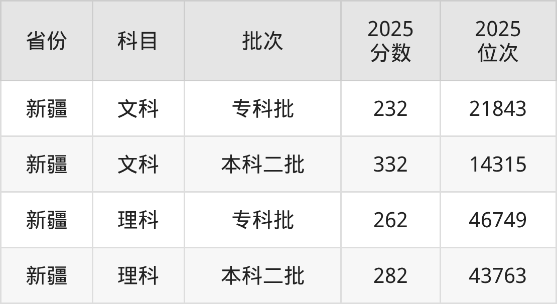 文科最低分对应地区为新疆,录取位次为21843,超专科线92分;最高分对应地区为新疆,录取位次为14315,超二本线2分。