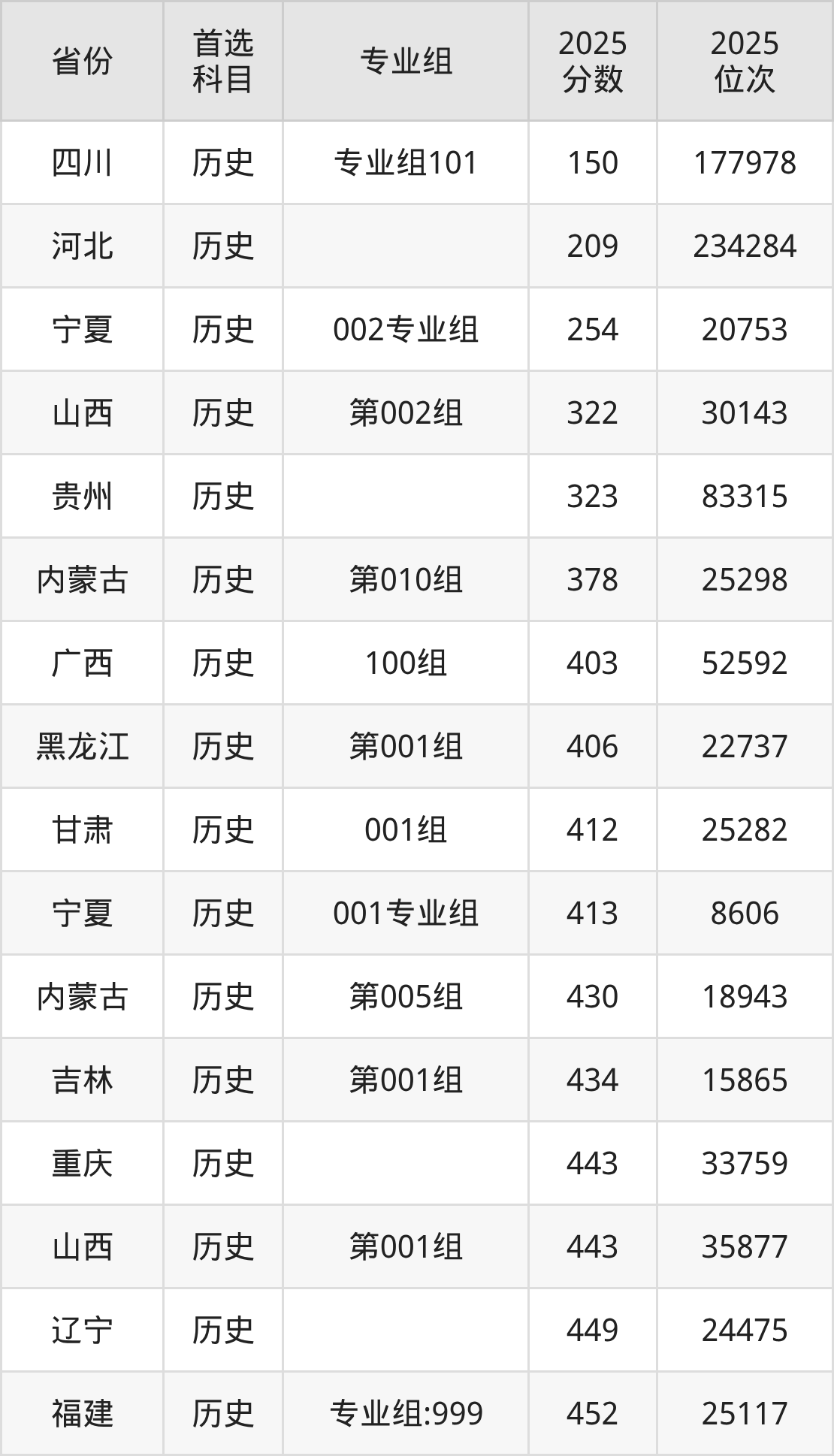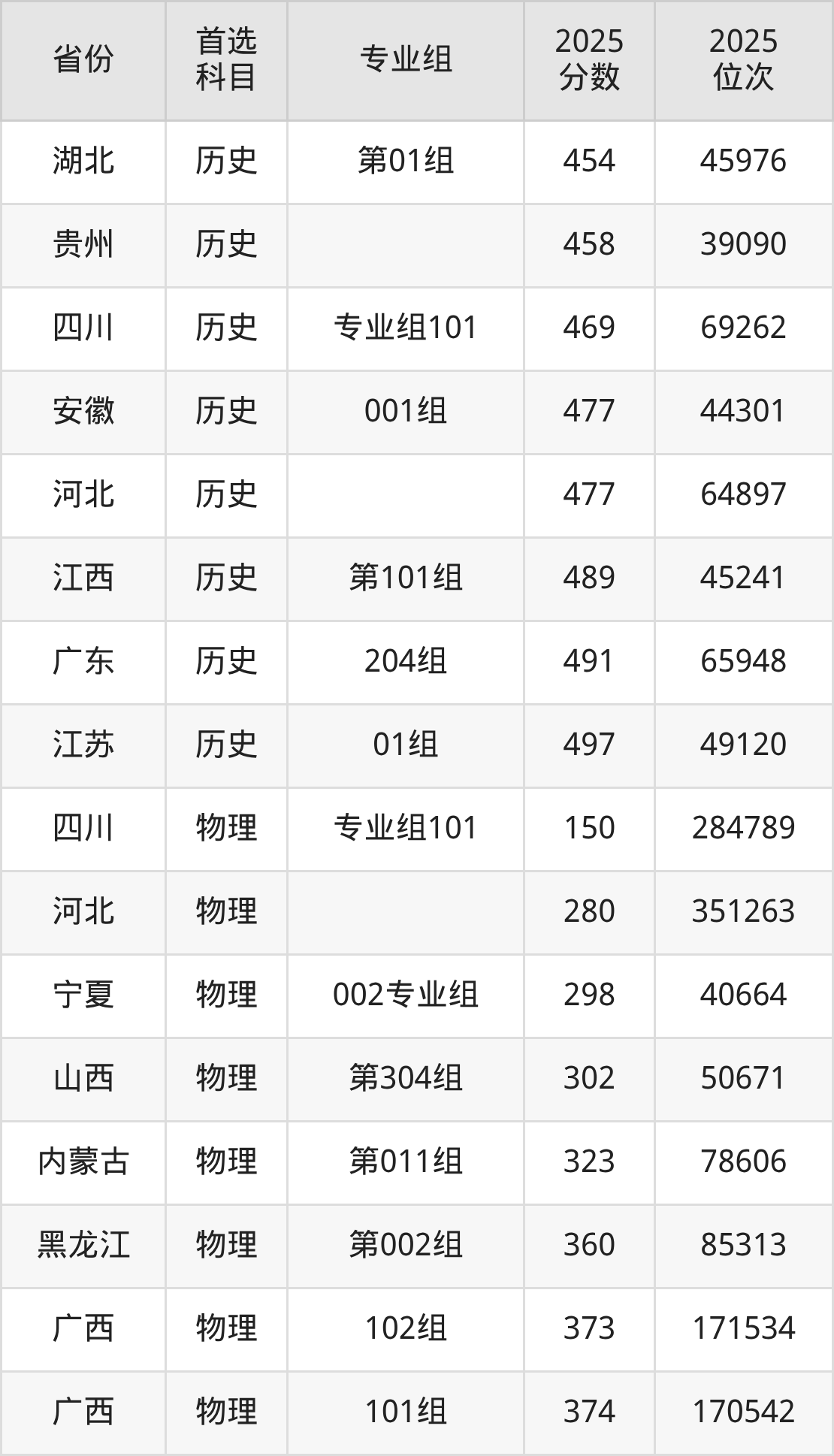 历史类最低分对应地区为四川(专业组101),录取位次为177978;最高分对应地区为江苏(01组),录取位次为49120,超本科线15分。