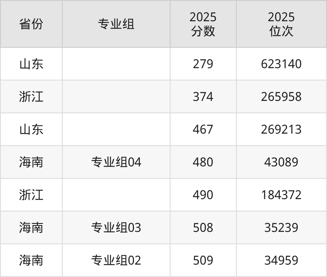 最低分对应地区为山东,录取位次为623140,超二段线129分;最高分对应地区为海南(专业组02),录取位次为34959,超本科线29分。