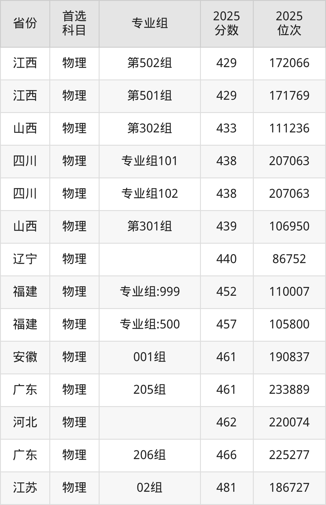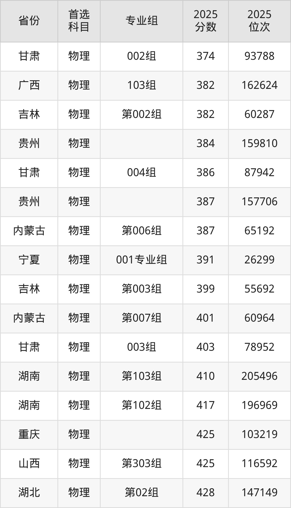 物理类最低分对应地区为四川(专业组101),录取位次为284789;最高分对应地区为江苏(02组),录取位次为186727,超本科线18分。
