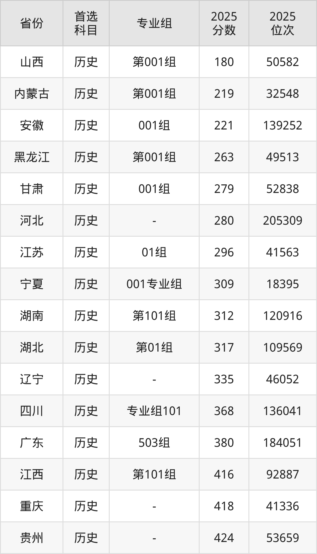 历史类最低分对应地区为山西(第001组),录取位次为50582;最高分对应地区为贵州,录取位次为53659,超专科线244分。
