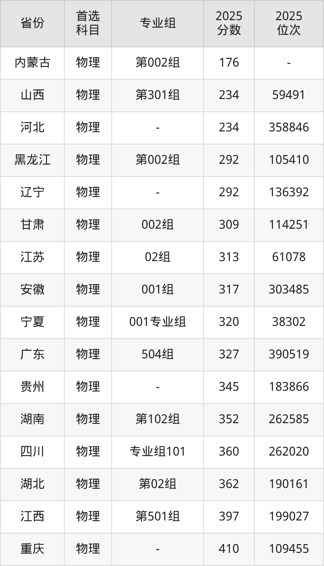 物理类最低分对应地区为内蒙古(第002组),超专科线16分;最高分对应地区为重庆,录取位次为109455。