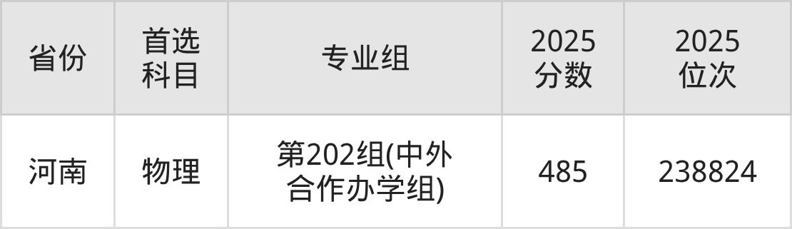 物理类最低分对应地区为河南(第202组(中外合作办学组)),录取位次为238824,超本科线58分。