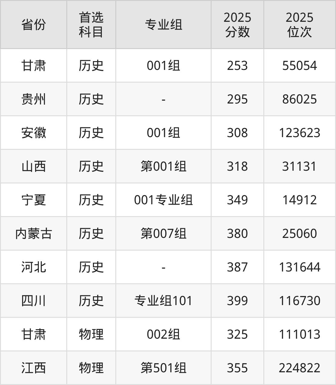 历史类最低分对应地区为甘肃(001组),录取位次为55054,超专科线93分;最高分对应地区为四川(专业组101),录取位次为116730,超专科线249分。