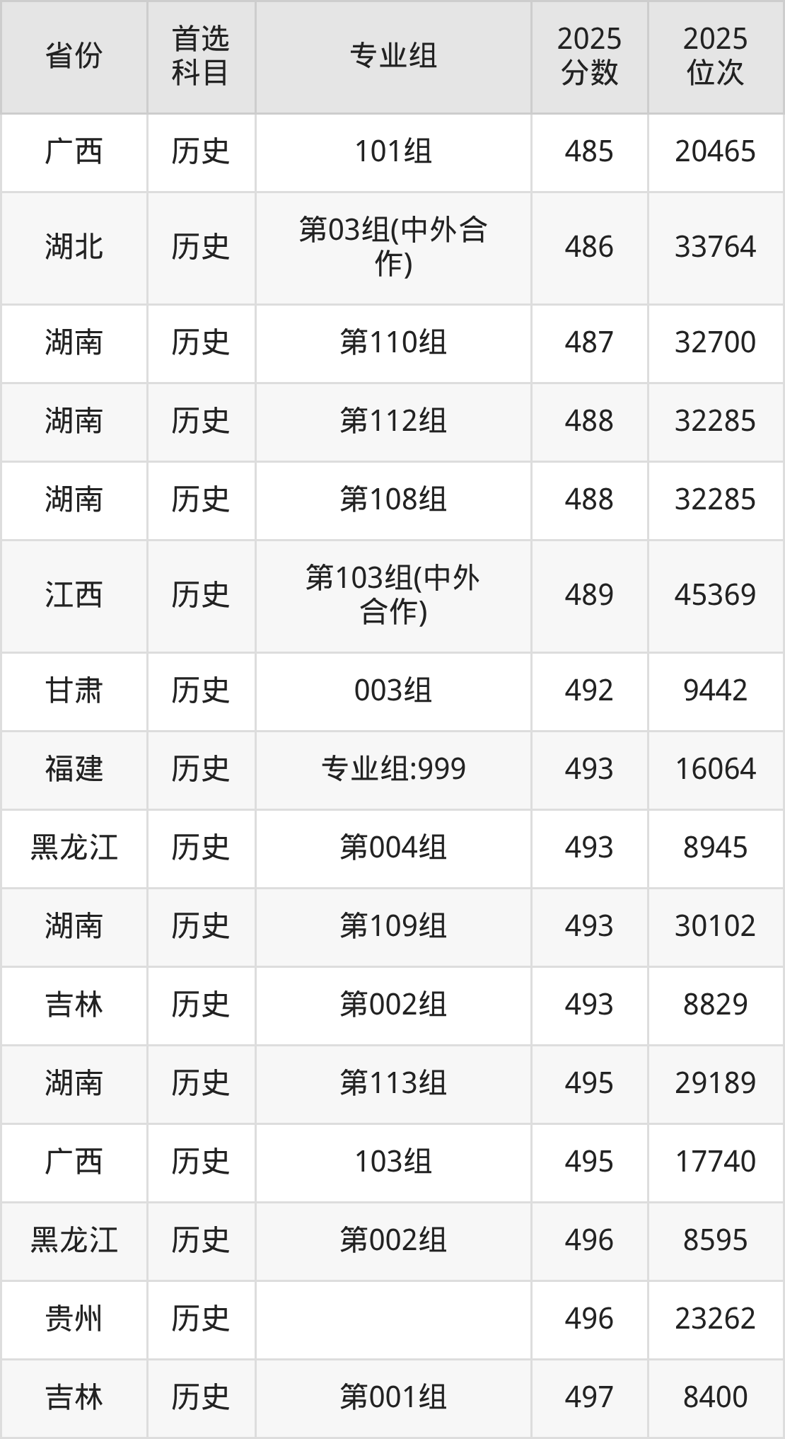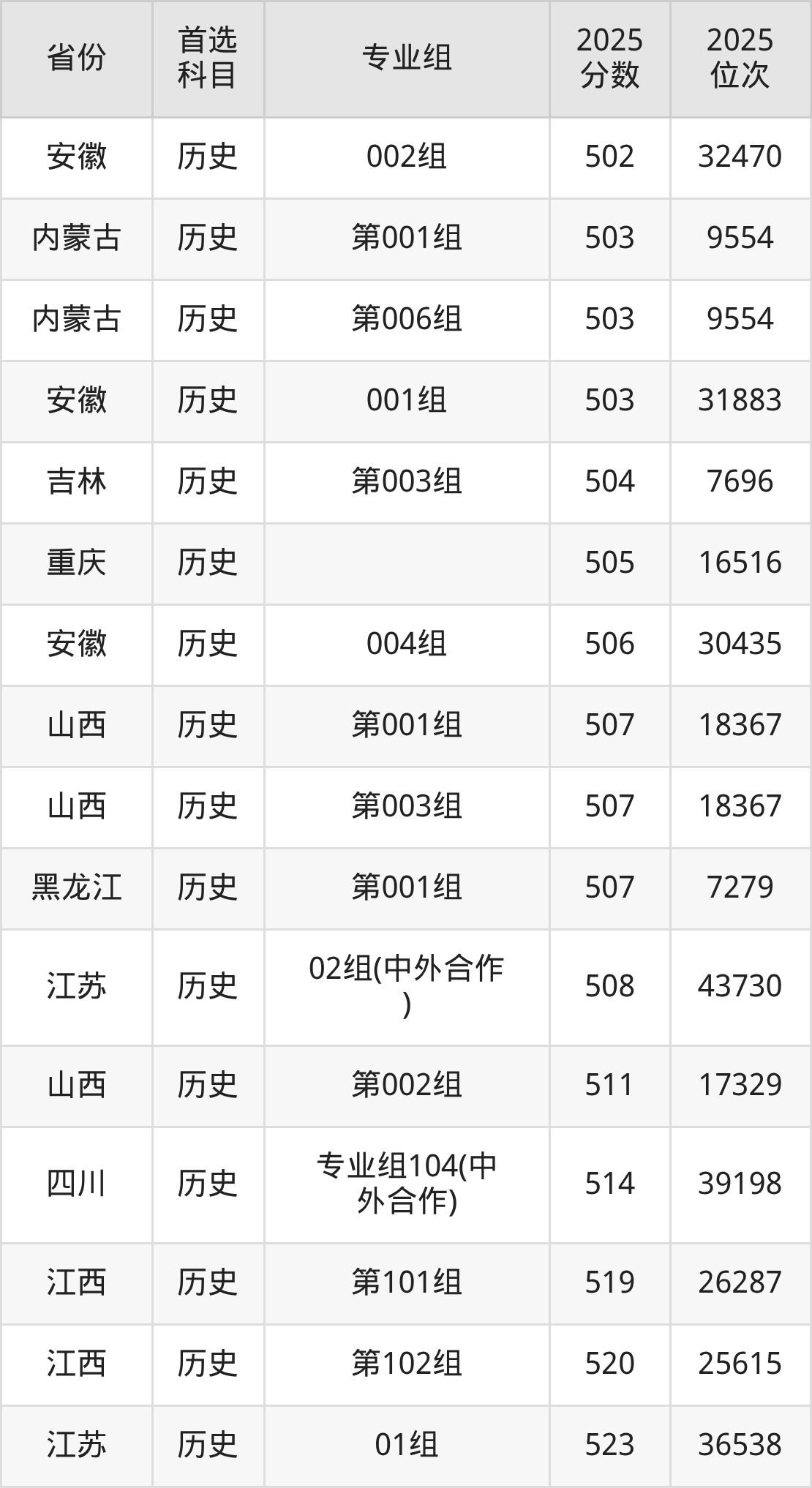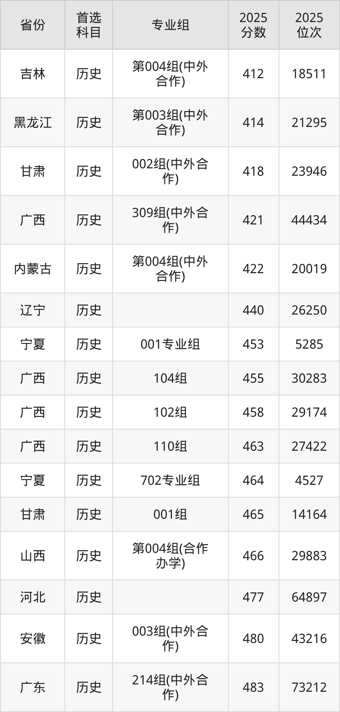 历史类最低分对应地区为吉林(第004组(中外合作)),录取位次为18511,超本科线28分;最高分对应地区为湖北(第02组),录取位次为18435,超本科线91分。