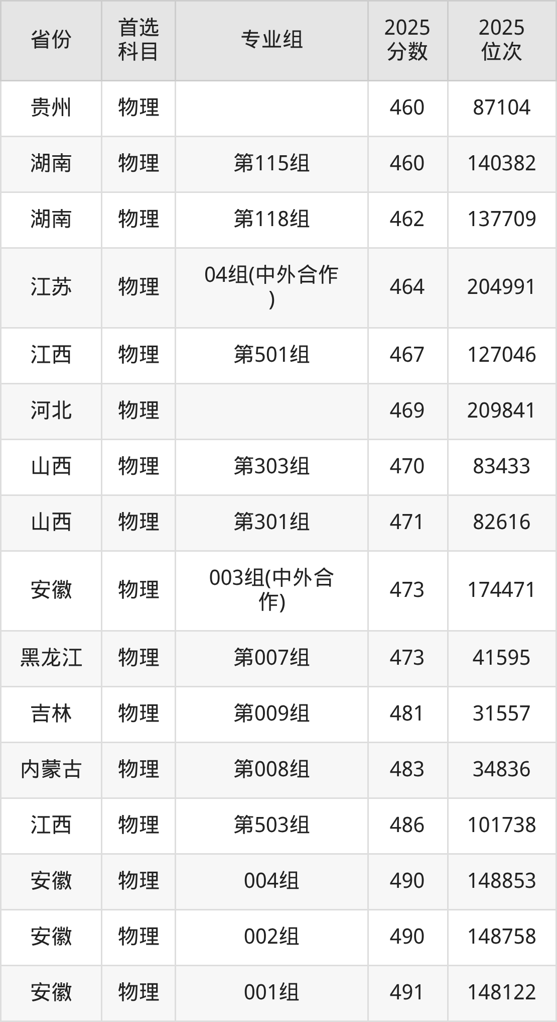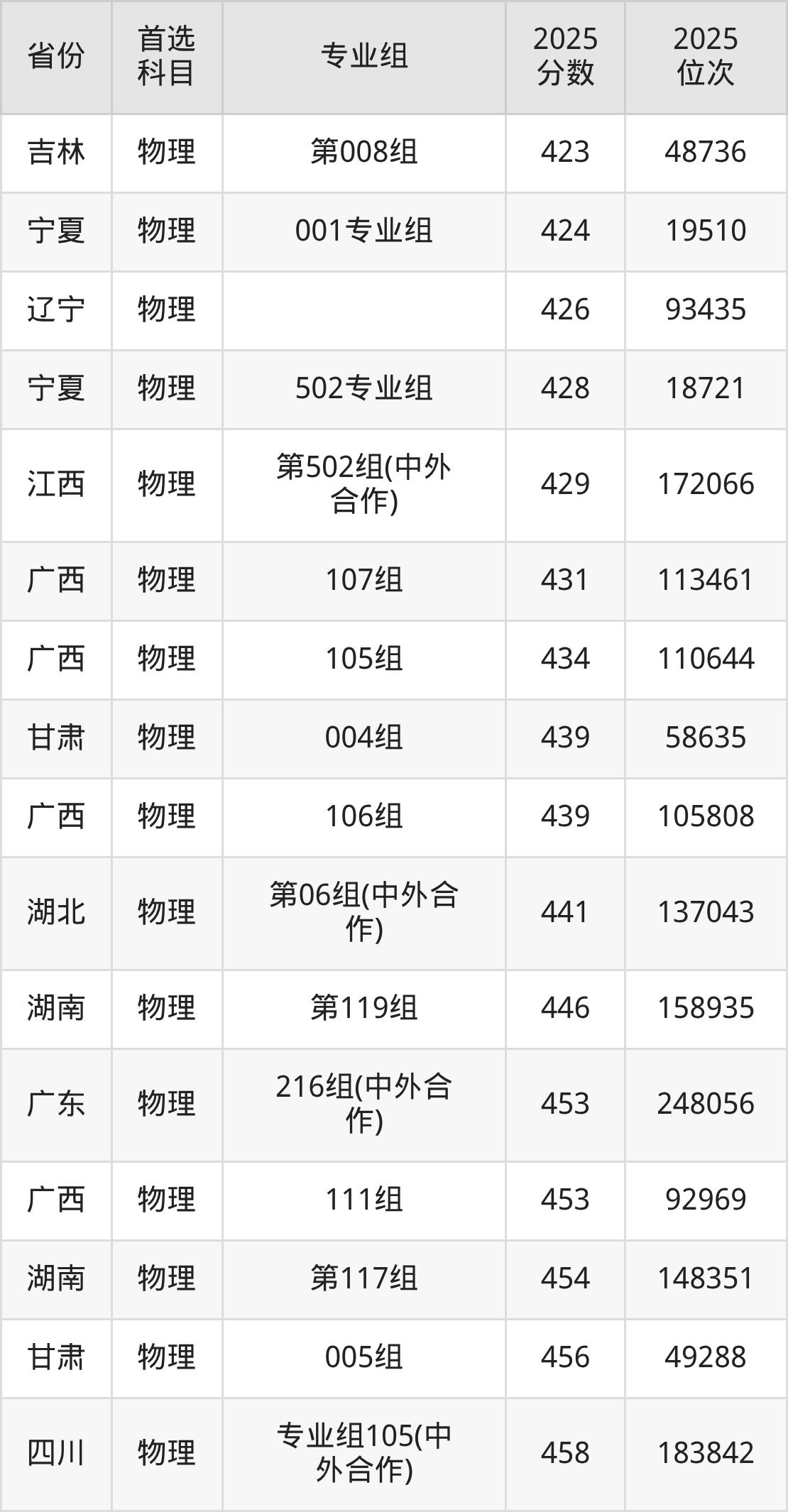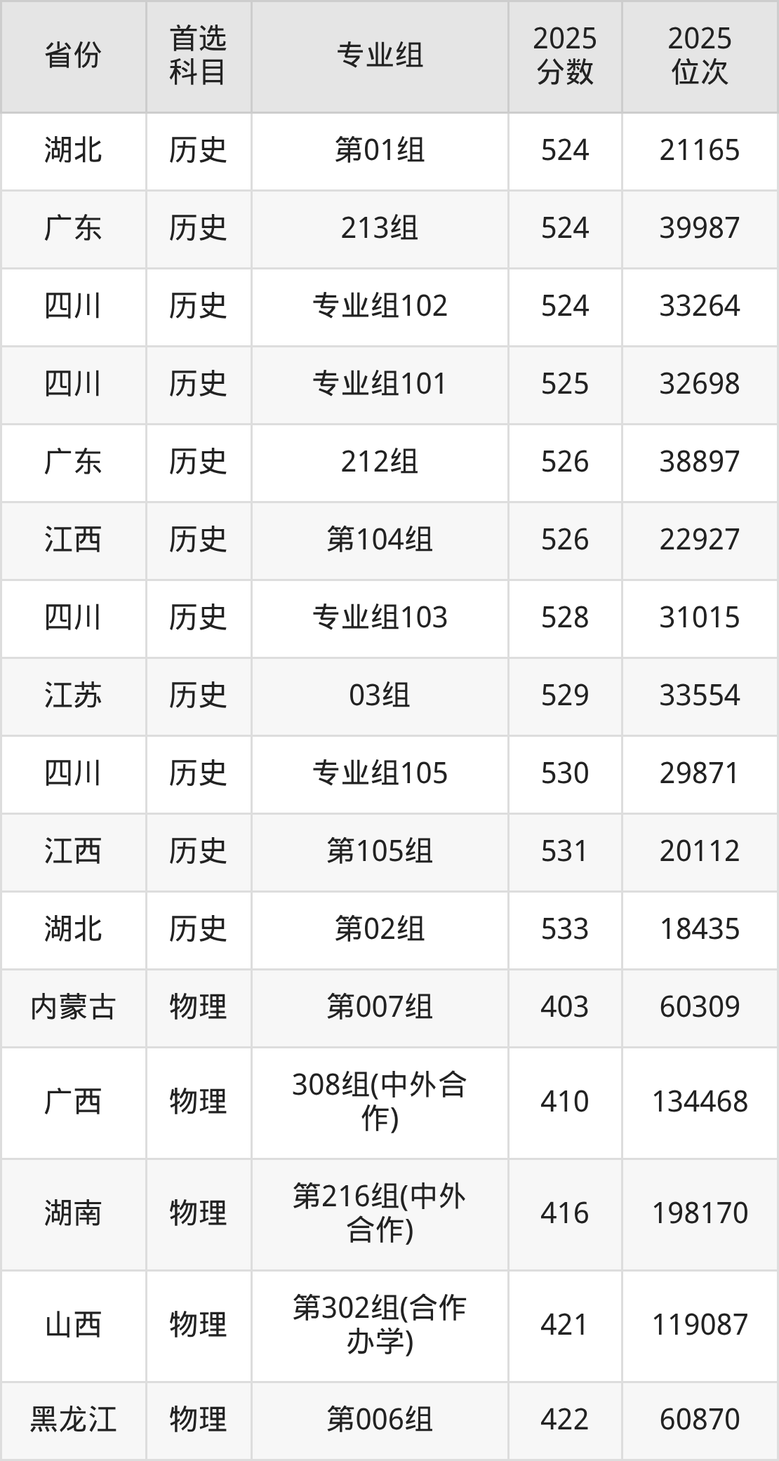 历史类最低分对应地区为吉林(第004组(中外合作)),录取位次为18511,超本科线28分;最高分对应地区为湖北(第02组),录取位次为18435,超本科线91分。