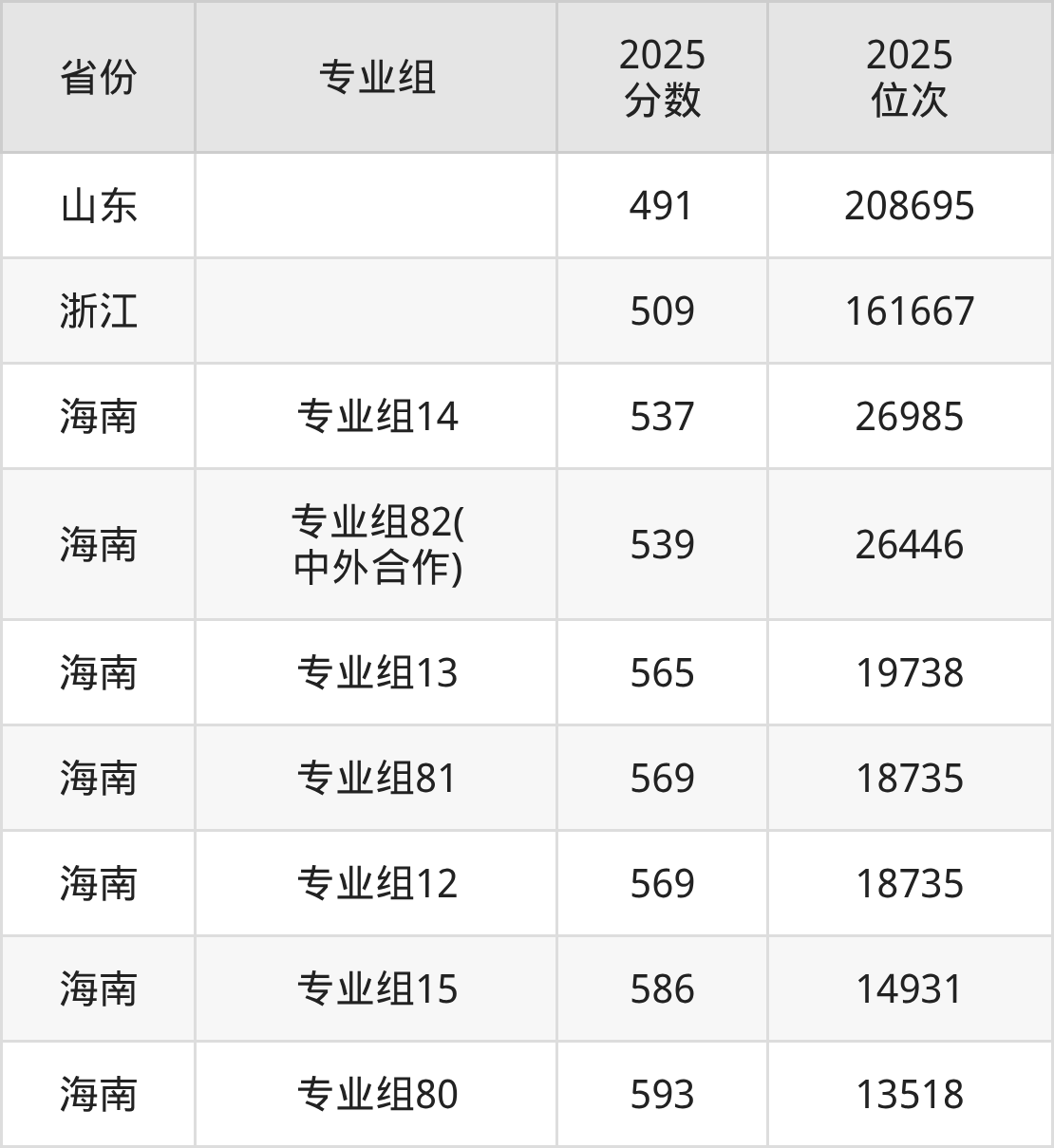 专业组12569分、18735名,专业组13565分、19738名,专业组14537分、26985名,专业组15586分、14931名,专业组80593分、13518名,专业组81569分、18735名,专业组82(中外合作)539分、26446名;