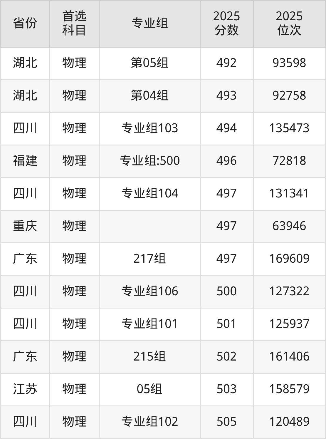 物理类最低分对应地区为内蒙古(第007组),录取位次为60309,超本科线28分;最高分对应地区为四川(专业组102),录取位次为120489,超本科B67分。