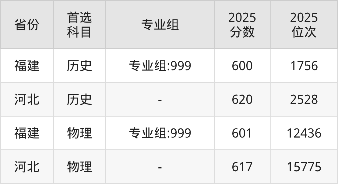 历史类最低分对应地区为福建(专业组:999),录取位次为1756;最高分对应地区为河北,录取位次为2528,超本科线143分。