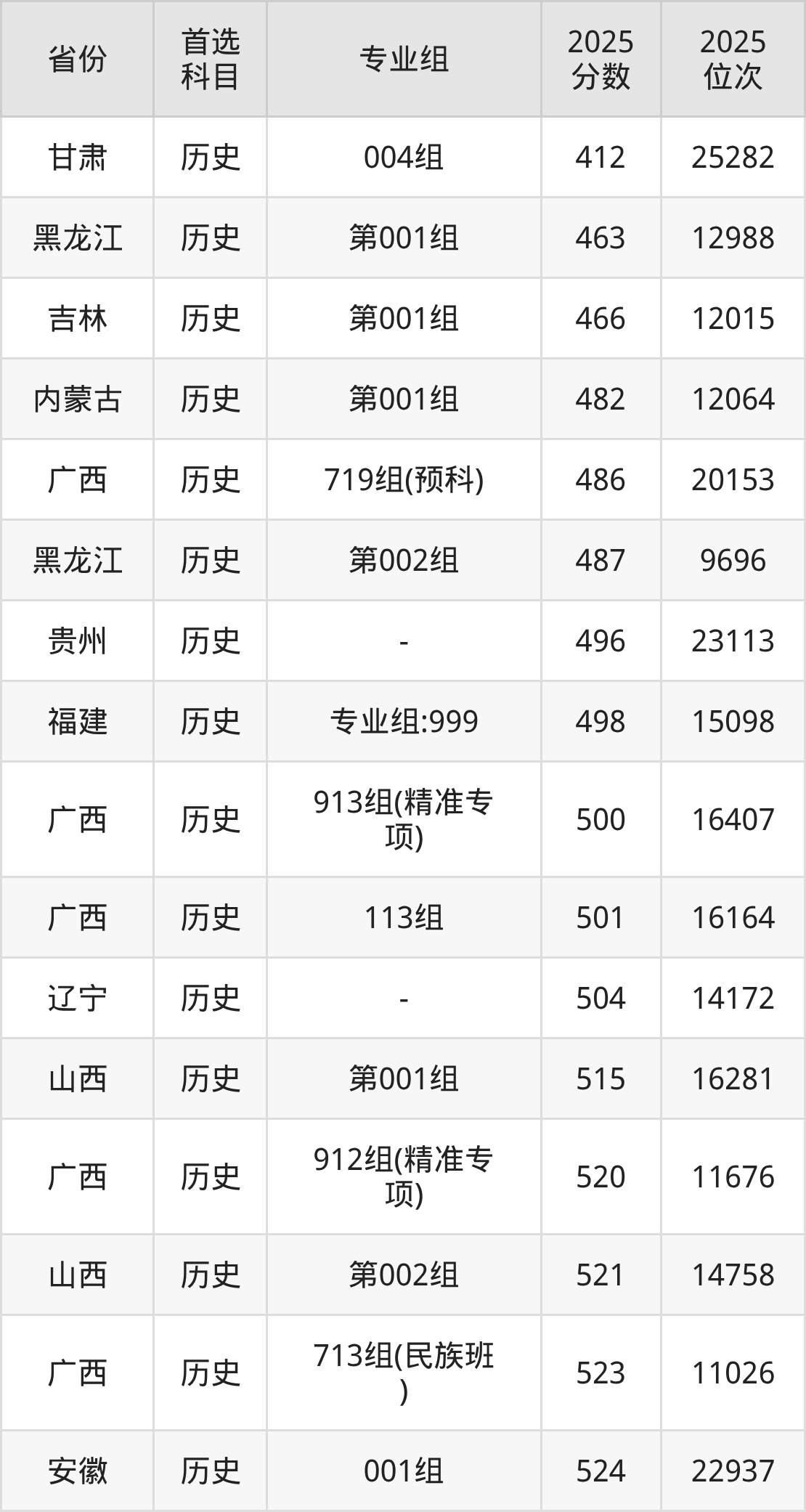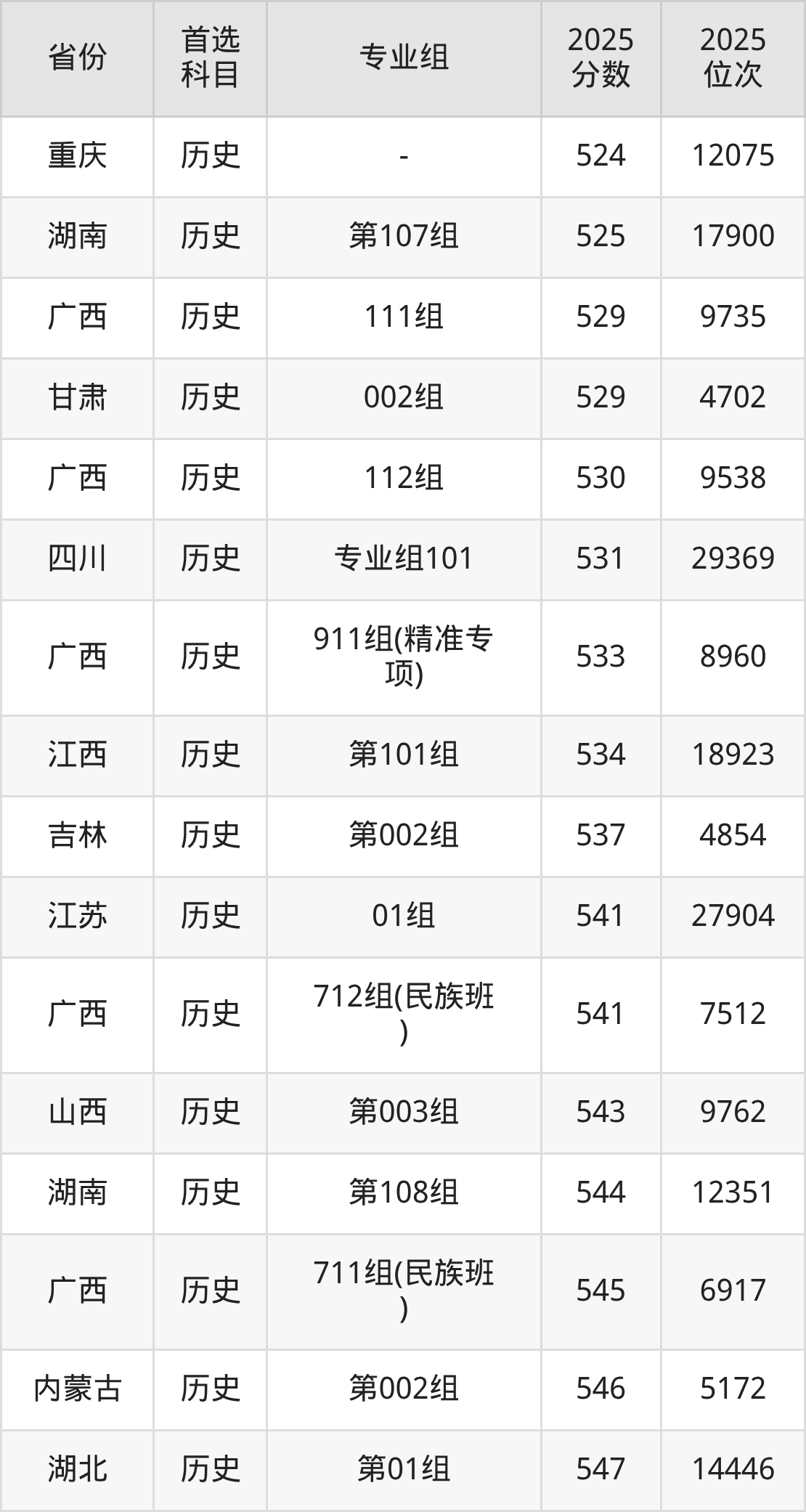 历史类:111组529分、9735名,112组530分、9538名,113组501分、16164名,711组(民族班)545分、6917名,712组(民族班)541分、7512名,713组(民族班)523分、11026名,719组(预科)486分、20153名,911组(精准专项)533分、8960名,912组(精准专项)520分、11676名,913组(精准专项)500分、16407名;