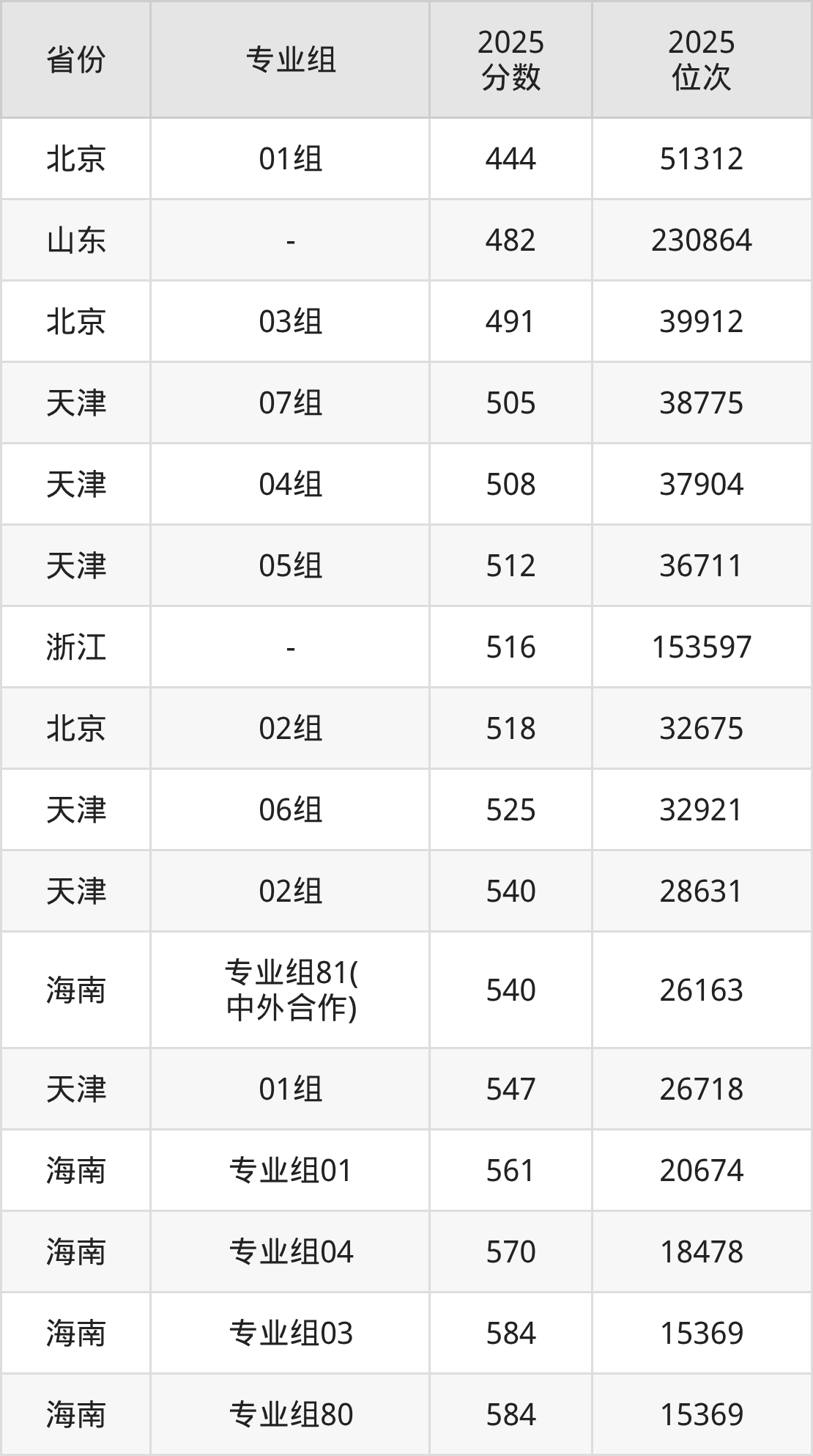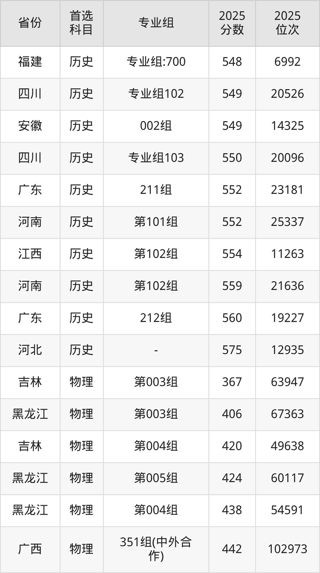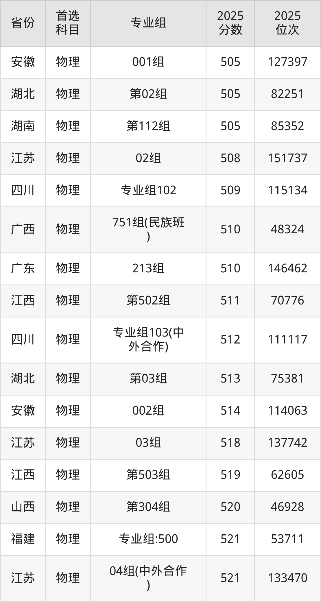 物理类:151组486分、65357名,153组503分、53860名,154组505分、52542名,156组469分、78348名,351组(中外合作)442分、99217名,751组(民族班)523分、40773名,753组(民族班)509分、49941名,754组(民族班)522分、41743名,756组(民族班)485分、66477名,759组(预科)467分、79688名,951组(精准专项)488分、64085名,953组(精准专项)510分、48936名,954组(精准专项)493分、60434名,956组(精准专项)465分、80823名;